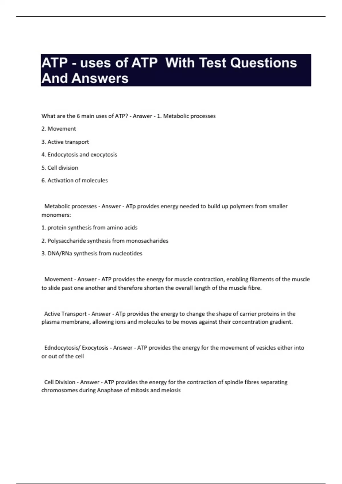 ATP - uses of ATP With Test Questions