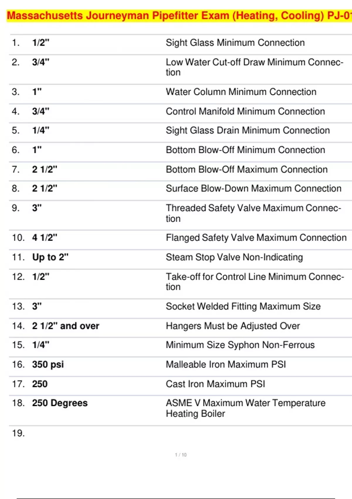 Massachusetts Journeyman Pipefitter Exam (Heating, Cooling) PJ-01 1. 1/2" Sight Glass Minimum Connection 2. 3/4" Low Water Cut-off Draw Minimum Connec- tion 3. 1" Water Column Minimum Connection 4. 3/4" Control Manifold Minimum Connection 5. 1/4" Sight Gla