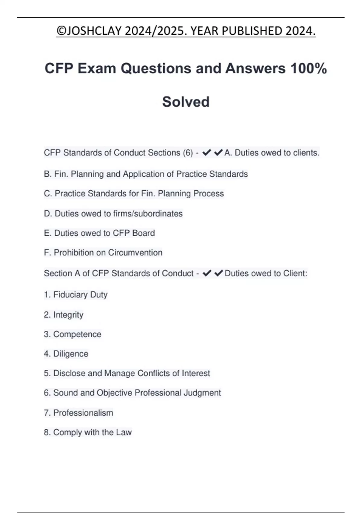 CFP Exam Questions and Answers 100% Solved CFP Standards of Conduct Sections (6) - A. Duties owed to clients. B. Fin. Planning and Application of Practice Standards C. Practice Standards for Fin. Planning Process D. Duties owed to firms/subordinates E. Duties owed to CFP Board F. Prohibition on Circumvention Section A of CFP Standards of Conduct - Duties owed to Client: 1. Fiduciary Duty 2. Integrity 3. Competence 4. Diligence 5. Disclose and Manage Conflicts of Interest 6. Sound and Objective Professional Judgment 7. Professionalism 8. Comply with the Law