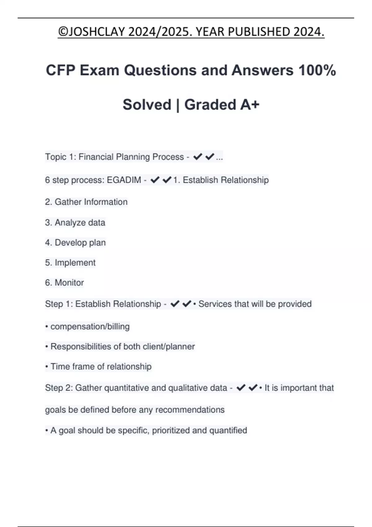 CFP Exam Questions and Answers 100% Solved | Graded A+ Topic 1: Financial Planning Process - ... 6 step process: EGADIM - 1. Establish Relationship 2. Gather Information 3. Analyze data 4. Develop plan 5. Implement 6. Monitor Step 1: Establish Relationship - • Services that will be provided • compensation/billing • Responsibilities of both client/planner • Time frame of relationship Step 2: Gather quantitative and qualitative data - • It is important that goals be defined before any recommendations • A goal should be specific, prioritized and quantified