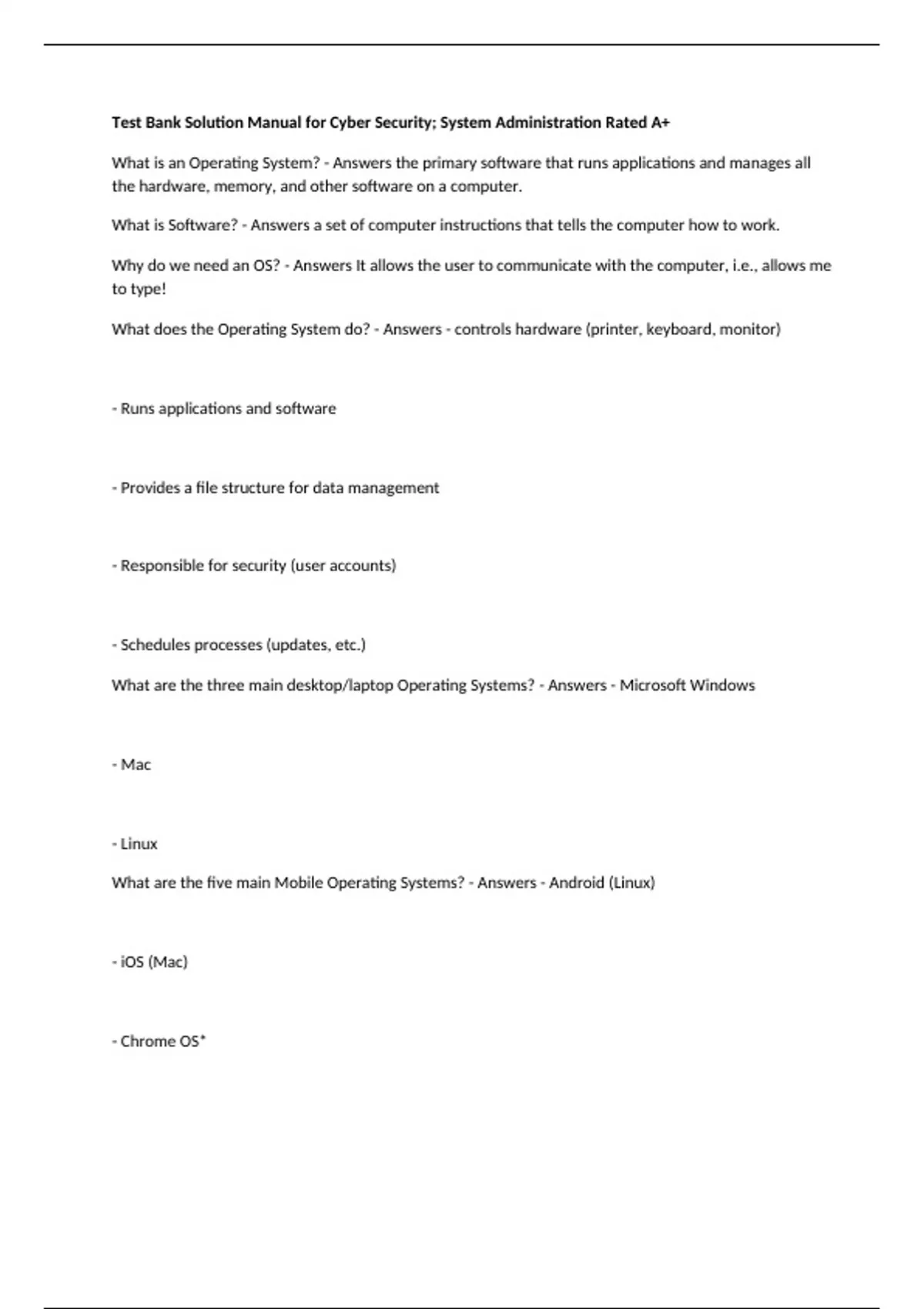 Test Bank Solution Manual for Cyber Security; System Administration Rated A+ What is an Operating System? - Answers the primary software that runs applications and manages all the hardware, memory, and other software on a computer. What is Software? - Answers a set of computer instructions that tells the computer how to work. Why do we need an OS? - Answers It allows the user to communicate with the computer, i.e., allows me to type! What does the Operating System do? - Answers - controls hardware (printer, keyboard, monitor) - Runs applications and software - Provides a file structure for data management - Responsible for security (user accounts) - Schedules processes (updates, etc.) What are the three main desktop/laptop Operating Systems? - Answers - Microsoft Windows - Mac - Linux What are the five main Mobile Operating Systems? - Answers - Android (Linux) - iOS (Mac) - Chrome OS* - Windows Phone - Blackberry What are the other types of OS's - Answers - Embedded OS - Firmware - Hypervisor Which of the following is a task that the operating system is NOT responsible for? - Manages hardware such as a mouse. - Keeps track of files and folders. - Supplies power to peripherals such as a printer. - Secures the computer with user accounts and passwords. - Answers Supplies power to peripherals such as a printer. Which of the following is most commonly considered a mobile OS? - Apple Macintosh - Android - Microsoft Windows - Linux - Answers Android Which type of operating system is permanently programmed into a hardware device? - Embedded OS - Firmware - Mobile OS - Hypervisor - Answers Firmware Which is the most popular mobile OS out of the choices below? - Chrome OS - Blackberry - Windows Phone - Android - Answers Android What is a server OS used for? - Handling requests and supplying responses. - Running multiple operating systems on a computer system. - Performing one task, such as in an STM machine. - Running a permanent system, like the timing controls in a washing machine. - Answers Handling requests and supplying responses. Which Operating System is named by its release year? - Answers Microsoft Windows What is a GUI? - Answers an interface that uses interactive graphical elements such as windows, buttons, and icons. What Operating System was named by big cats then landmarks in California? - Answers Mac What Operating System is free to use and is an open-source system? - Answers Linux What is a file system? - Answers a method of organizing files and retrieving them from storage What are the top four file systems? - Answers - FAT32 - NTFS - HFS - Ext4 What is FAT32 (File Allocation Table)? - Answers A file system that is