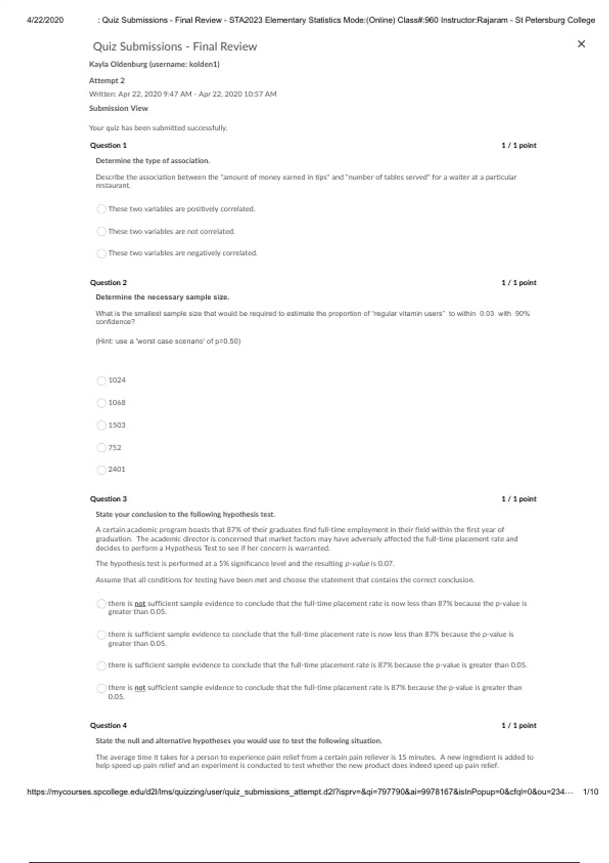 , 4/22/2020 : Quiz Submissions - Final Review - STA2023 Elementary Statistics Mode:(Online) Class#:960 Instructor:Rajaram - St Petersburg College