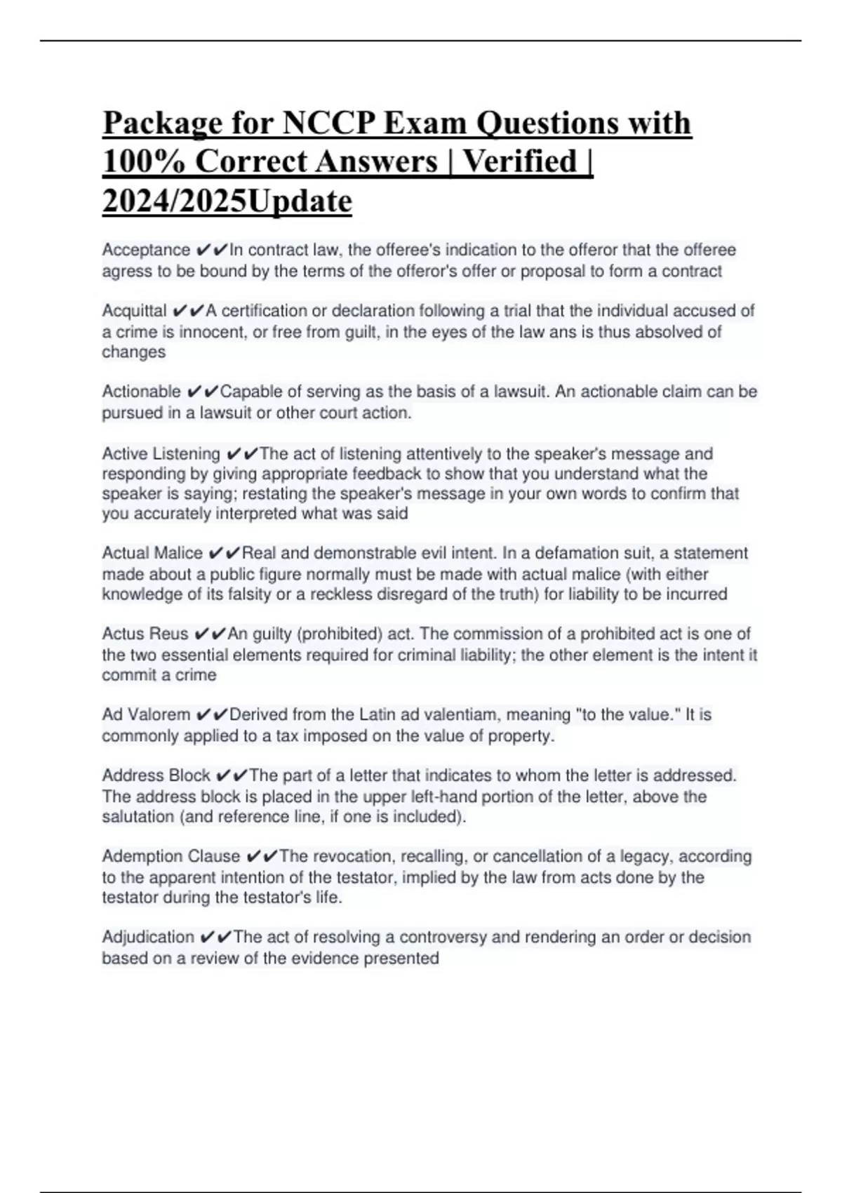 Package for NCCP Exam Questions with 100% Correct Answers | Verified | 2024/2025Update Acceptance In contract law, the offeree's indication to the offeror that the offeree agress to be bound by the terms of the offeror's offer or proposal to form a contract Acquittal A certification or declaration following a trial that the individual accused of a crime is innocent, or free from guilt, in the eyes of the law ans is thus absolved of changes Actionable Capable of serving as the basis of a lawsuit. An actionable claim can be pursued in a lawsuit or other court action