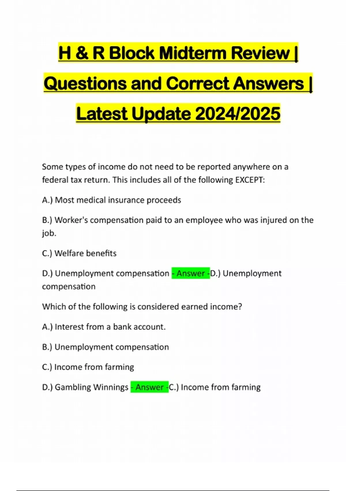 H & R Block Midterm Review | Questions and Correct Answers | Latest Update 2024/2025 Some types of income do not need to be reported anywhere on a federal tax return. This includes all of the following EXCEPT: A.) Most medical insurance proceeds B.) Worker's compensation paid to an employee who was injured on the job. C.) Welfare benefits D.) Unemployment compensation - Answer -D.) Unemployment compensation Which of the following is considered earned income? A.) Interest from a bank account. B.) Unemployment compensation C.) Income from farming D.) Gambling Winnings - Answer -C.) Income from farmingWhich of the following shows these numbers rounded correctly: $31.43, $143.57, $369.22, $1,547.88? A.) $32. $142. $368. $1,547 B.) $31. $144. $369. $1,548 C.) $31. $142. $369. $1,547. D.) $32. $144. $368. $1,547 - Answer -B.) $31. $144. $369. $1,548 The tax on income that comes entirely from wages under $100,000 is determined according to the? A.) Tax tables