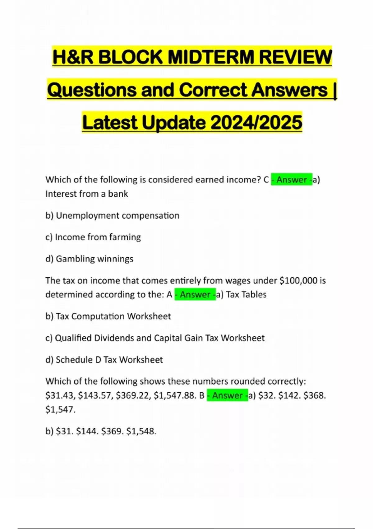 H&R BLOCK MIDTERM REVIEW Questions and Correct Answers | Latest Update 2024/2025 Which of the following is considered earned income? C - Answer -a) Interest from a bank b) Unemployment compensation c) Income from farming d) Gambling winnings The tax on income that comes entirely from wages under $100,000 is determined according to the: A - Answer -a) Tax Tables b) Tax Computation Worksheet c) Qualified Dividends and Capital Gain Tax Worksheet d) Schedule D Tax Worksheet Which of the following shows these numbers rounded correctly: $31.43, $143.57, $369.22, $1,547.88. B - Answer -a) $32. $142. $368. $1,547.