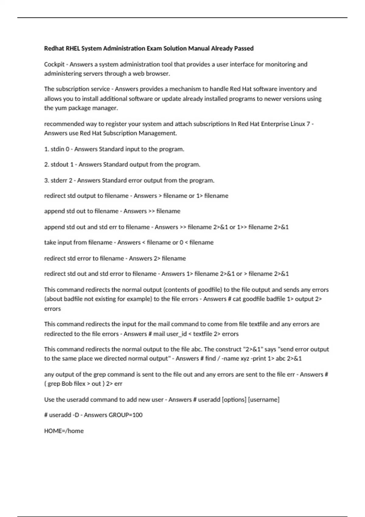 Redhat RHEL System Administration Exam Solution Manual Already Passed Cockpit - Answers a system administration tool that provides a user interface for monitoring and administering servers through a web browser. The subscription service - Answers provides a mechanism to handle Red Hat software inventory and allows you to install additional software or update already installed programs to newer versions using the yum package manager. recommended way to register your system and attach subscriptions In Red Hat Enterprise Linux 7 - Answers use Red Hat Subscription Management. 1. stdin 0 - Answers Standard input to the program. 2. stdout 1 - Answers Standard output from the program. 3. stderr 2 - Answers Standard error output from the program. redirect std output to filename - Answers > filename or 1> filename append std out to filename - Answers >> filename append std out and std err to filename - Answers >> filename 2>&1 or 1>> filename 2>&1 take input from filename - Answers < filename or 0 < filename redirect std error to filename - Answers 2> filename redirect std out and std error to filename - Answers 1> filename 2>&1 or > filename 2>&1 This command redirects the normal output (contents of goodfile) to the file output and sends any errors (about badfile not existing for example) to the file errors - Answers # cat goodfile badfile 1> output 2> errors This command redirects the input for the mail command to come from file textfile and any errors are redirected to the file errors - Answers # mail user_id < textfile 2> errors This command redirects the normal output to the file abc. The construct "2>&1" says "send error output to the same place we directed normal output" - Answers # find / -name xyz -print 1> abc 2>&1 any output of the grep command is sent to the file out and any errors are sent to the file err - Answers # ( grep Bob filex > out ) 2> err Use the useradd command to add new user - Answers # useradd [options] [username] # useradd -D - Answers GROUP=100 HOME=/home INACTIVE=-1 EXPIRE= SHELL=/bin/bash SKEL=/etc/skel CREATE_MAIL_SPOOL=yes For example - Answers to change the default user shell for new user to /bin/ksh :,# useradd -D -s /bin/ksh To simple add a user with all default options : - Answers # useradd user01 To add user with uid 1099 - Answers comment "new user" and default shell as /bin/ksh : , # useradd -u 1099 -c "new user" -s /bin/ksh user01 Check new user's entry in /etc/passwd file : - Answers grep user01 /etc/passwd To modify existing user (e.g. changing the comment) : - Answers # usermod -c "modified user" user01 To assign the password to new user: - Answers # passwd user01 View the /etc/shadow file : - Answers # grep user01 /etc/shadow user01:$6$dox84xyJ$89DdMcxSlI9OHxUCyY1ryaFsmG6MSEwbmSbZXJoFY.tHgdEEeQQgQjDV0dD8jEiHusrUjj3p8gtMTKR4sXXN5.:17058:0:45:7::: You can create a user with nologin shell for running services such as SMTP and FTP etc. A user without a login shell can not login to a system and therefore cannot run any command on the system interactively on the system. Processes can run as that users however. To add new user "test" with shell nologin : - Answers # useradd -s /sbin/nologin test Make sure the nologin shell is present in the /etc/shells file : - Answers # cat /etc/shells create softlink - Answers # ln -s file link # ls -l -rw-r--r-- 1 root root 0 Sep 19 14:41 link lrwxrwxrwx 1 root root 5 Sep 19 15:41 link -> file - Answers The "l" in the "ls -l" command output above indicates that the file is a soft link. 2. The size of the soft link created in the example above is the no of characters in the pathname (file) which is 5 (it can be absolute or relative). 3. If you delete the original file (file) the soft link render as useless. 4. Soft links can reside on different file systems. 5. You can create soft links to directories also. create hard link - Answers # ln file1 file2 # ls -li 1282 -rw-r--r-- 2 root 0 root 0 Sep 23 13:19 file1 1282 -rw-r--r-- 2 root 0 root 0 Sep 23 13:19 file2 # find . -inum 1282 ./file1 ./file2 - Answers 2. The link count increases by one. everytime you create a new hard link to the file as shown above. 3. Even if you delete any one of the file. it has no effect on the other file. Only the link count decrements 4. Hard links can not cross the file system. 5. You can not create hard links to directories. display the current date and time - Answers #date display the current date and time verbosely universal time time zone - Answers #timedatectl To display all network connections - Answers ~]# nmcli con show To display the active network connection - Answers ~]# nmcli con show --active To display all network configuration settings of a particular connection - Answers ~]# nmcli con show "con-name" GUI Web base to monitor all things of RHEL - Answers Cockpit various types of network interfaces - Answers bond, team, bridge, VLAN
