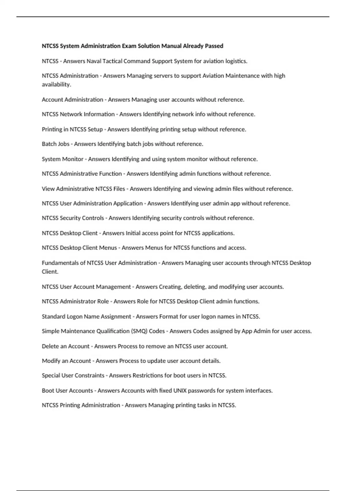 NTCSS System Administration Exam Solution Manual Already Passed NTCSS - Answers Naval Tactical Command Support System for aviation logistics. NTCSS Administration - Answers Managing servers to support Aviation Maintenance with high availability. Account Administration - Answers Managing user accounts without reference. NTCSS Network Information - Answers Identifying network info without reference. Printing in NTCSS Setup - Answers Identifying printing setup without reference. Batch Jobs - Answers Identifying batch jobs without reference. System Monitor - Answers Identifying and using system monitor without reference. NTCSS Administrative Function - Answers Identifying admin functions without reference. View Administrative NTCSS Files - Answers Identifying and viewing admin files without reference. NTCSS User Administration Application - Answers Identifying user admin app without reference. NTCSS Security Controls - Answers Identifying security controls without reference. NTCSS Desktop Client - Answers Initial access point for NTCSS applications. NTCSS Desktop Client Menus - Answers Menus for NTCSS functions and access. Fundamentals of NTCSS User Administration - Answers Managing user accounts through NTCSS Desktop Client. NTCSS User Account Management - Answers Creating, deleting, and modifying user accounts. NTCSS Administrator Role - Answers Role for NTCSS Desktop Client admin functions. Standard Logon Name Assignment - Answers Format for user logon names in NTCSS. Simple Maintenance Qualification (SMQ) Codes - Answers Codes assigned by App Admin for user access. Delete an Account - Answers Process to remove an NTCSS user account. Modify an Account - Answers Process to update user account details. Special User Constraints - Answers Restrictions for boot users in NTCSS. Boot User Accounts - Answers Accounts with fixed UNIX passwords for system interfaces. NTCSS Printing Administration - Answers Managing printing tasks in NTCSS. NTCSS Printer Configuration Utility - Answers A program enabling application administrators to add, edit, and delete output types using a graphical interface, representing the virtual link between printers and an application. Output Types - Answers Represent the virtual link between printers and an application, defined by program groups to satisfy printing needs. Print Request Queue Utility - Answers Allows client/server programs to submit print requests to any NTCSS registered printer through API calls. Printer Adapter - Answers Component of every NTCSS printer within the NTCSS Printer Configuration Utility, created before the printer, specifying information such as name, location, and IP address/FQDN. Printer - Answers Component of every NTCSS printer within the NTCSS Printer Configuration Utility, specifying information such as name, classification, printer access, location, request size, adapter port, adapter, printer class, suspend state, redirection information, and application list. Common UNIX Printing System (CUPS) - Answers Provides a mechanism allowing print jobs to be sent to printers in a standard fashion, acting as the print spooler, scheduler, and print job manager. Predefined Jobs - Answers Jobs defined when an application is set up but not started when an NTCSS server is started. Batch Job Queue - Answers Application where qualified administrators manage batch jobs, with resource-intensive jobs potentially affecting user response times. Predefined Jobs (Newly Created) - Answers Predefined jobs with static command-line arguments, available to application users with proper access roles. Batch Job Queue Application - Answers Application allowing modifications to batch jobs by qualified administrators, with different user roles having varying levels of job visibility. Batch Job Manager Tab - Answers Tab in the Batch Job Queue application for selecting an application and job status to view. NTCSS Predefined Job Manager Tab - Answers Tab for NTCSS or application administrators to manage predefined jobs, including adding, editing, and deleting jobs. Approved Job Queue - Answers List of approved jobs showing status based on system parameters like Running, Waiting Execution, and Run Next. Suspended Batch Jobs - Answers Batch jobs that require action to run, with details available by selecting and double-clicking on the suspended job. Scheduled Batch Jobs - Answers Jobs scheduled to run automatically at a set time, moving to the completed jobs queue upon finishing. Predefined Job List - Answers List of pre-defined jobs that can be added, edited, or deleted by the application administrator, showing title, command, type, and access roles. NTCSS System Monitor - Answers Utility enabling administrators to view system information, perform administrative tasks, and filter system log records. System Monitor Utility - Answers Tool allowing NTCSS administrators to perform tasks like viewing system information and disabling user logon accounts. Change Log - Application Printer Configuration - Answers Utility for application administrators to manage output types and their connection to printers using a graphical interface. Change Log - User Administration - Answers Function displaying changes made to User Configuration, aiding in validating correct recording of changes. User Administration Facility - Answers Overview located in NTCSS Security Control for user management. NTCSS II - Answers Environment required to be active on the master server for system operations. NTCSS Administrator - Answers Role with access required to perform system tasks. Request For User Registration Services form - Answers Form to complete for user access requests. System Log - Answers Records all system events and can be filtered for specific entries. Change Log - Printer Configuration - Answers Utility for managing printers, adapters, and printer settings. Log File Management - Answers Includes viewing security, messages, and NTCSS messages log files. Security Log File - Answers Focuses on