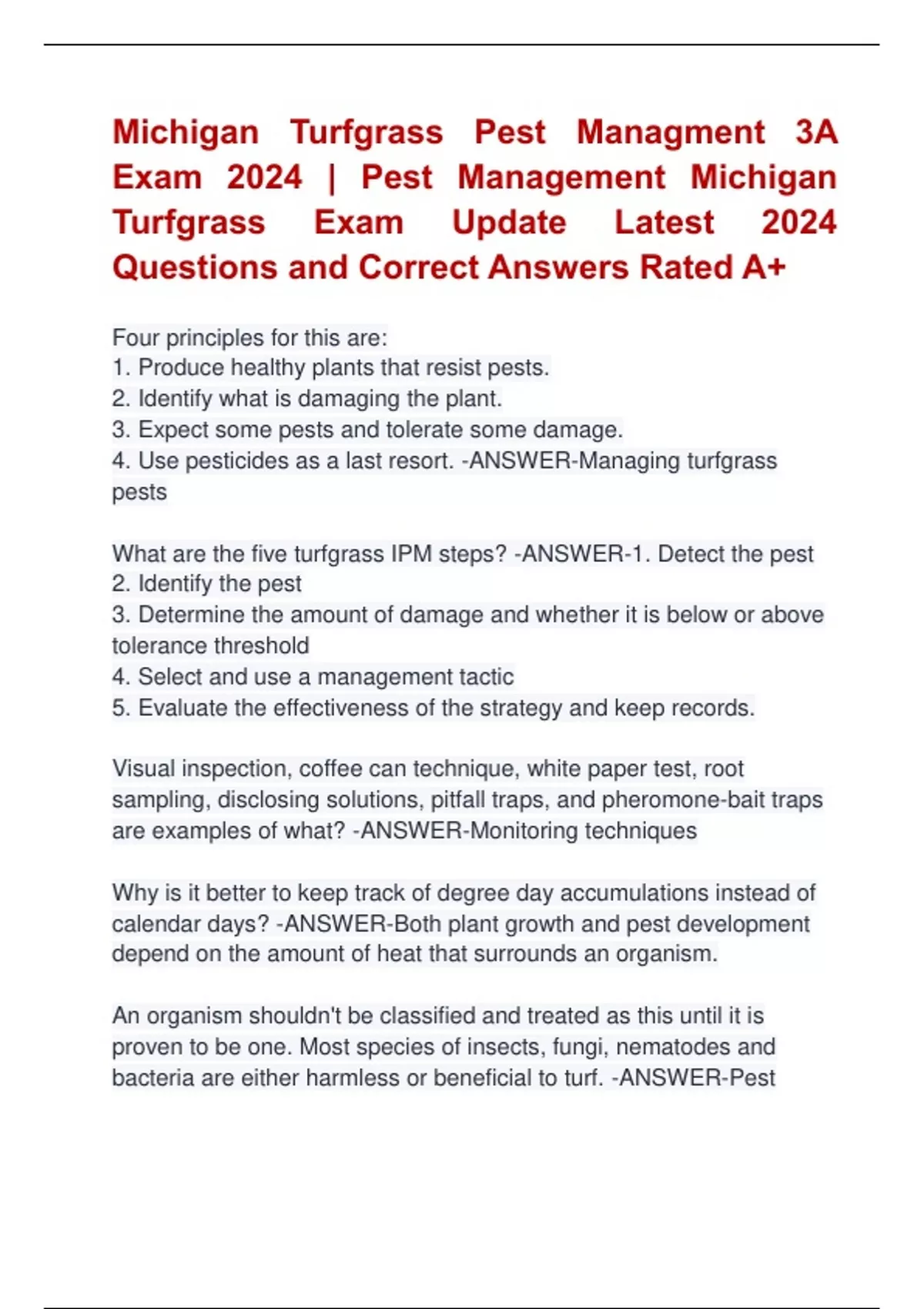 Michigan Turfgrass Pest Managment 3A Exam 2024 | Pest Management Michigan Turfgrass Exam Update Latest 2024 Questions and Correct Answers Rated A+