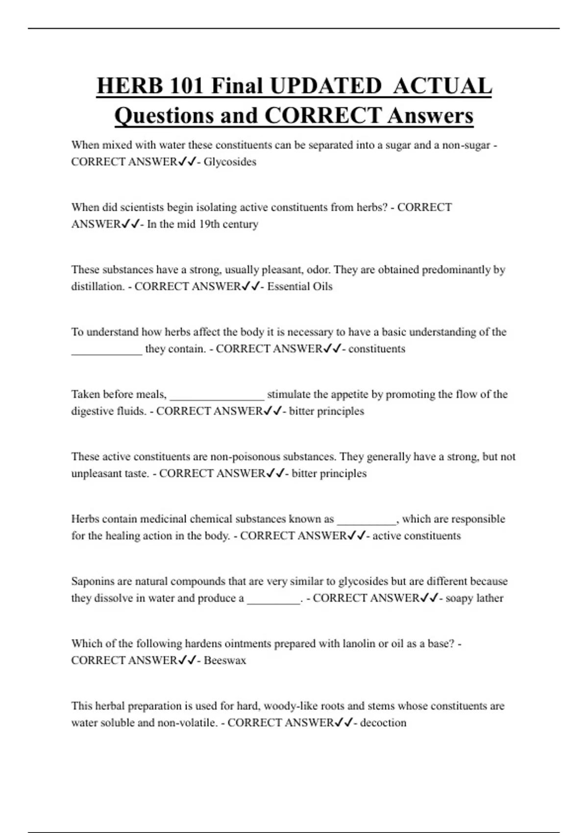 HERB 101 Final UPDATED ACTUAL Questions and CORRECT Answers