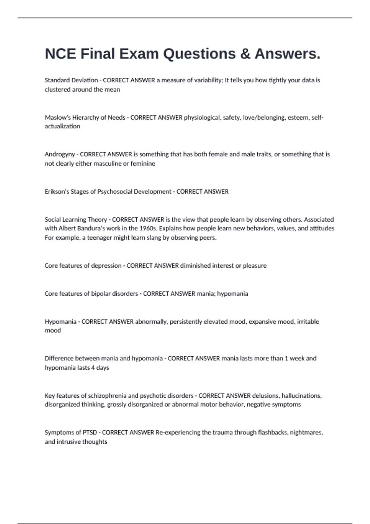 Difference between mania and hypomania - CORRECT ANSWER mania lasts more than 1 week and