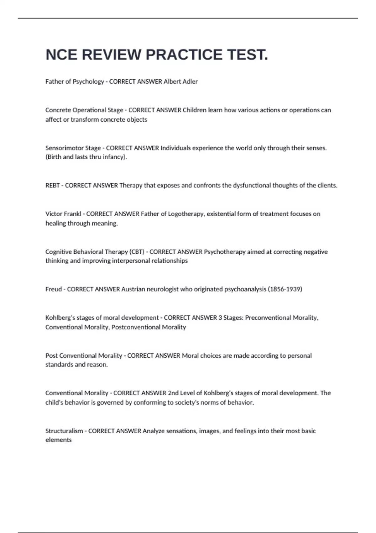 Cognitive Behavioral Therapy (CBT) - CORRECT ANSWER Psychotherapy aimed at correcting negative