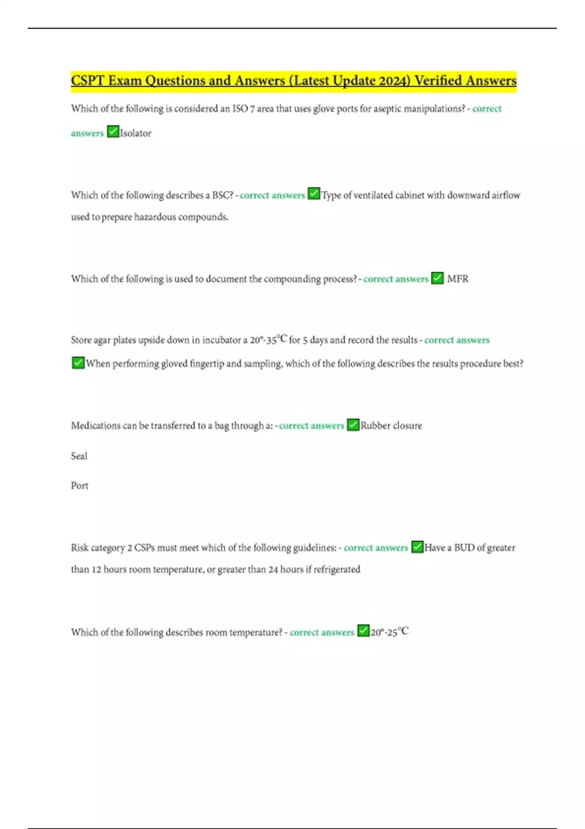 Which of the following is considered an ISO 7 area that uses glove ports for aseptic manipulations? - correct answers Isolator Which of the following describes a BSC? - correct answers Type of ventilated cabinet with downward airflow used to prepare hazardous compounds. Which of the following is used to document the compounding process? - correct answers MFR Store agar plates upside down in incubator a 20°-35℃ for 5 days and record the results - correct answers When performing gloved fingertip and sampling, which of the following describes the results procedure best? Medications can be transferred to a bag through a: - correct answers Rubber closure Seal Port Risk category 2 CSPs must meet which of the following guidelines: - correct answers Have a BUD of greater than 12 hours room temperature, or greater than 24 hours if refrigerated Which of the following describes room temperature? - correct answers 20°-25℃