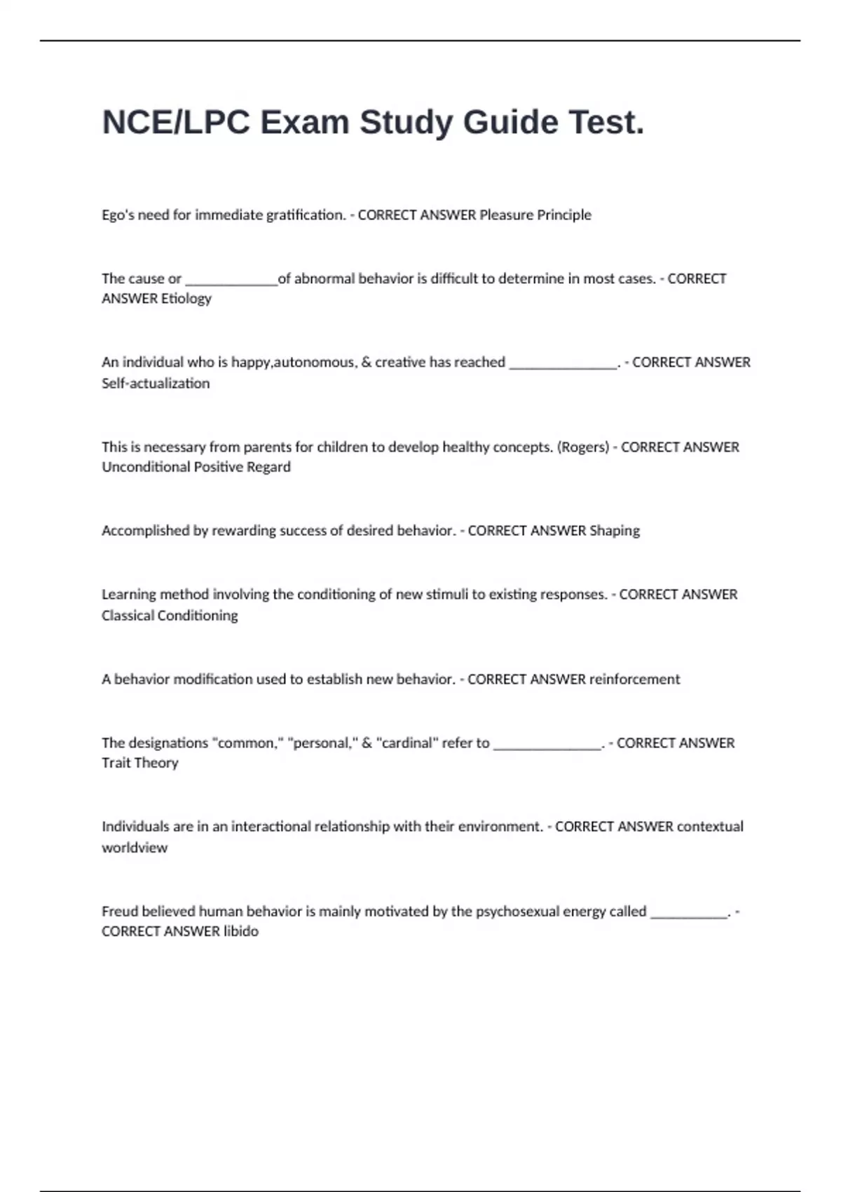 NCE/LPC Exam Study Guide Test. Ego's need for immediate gratification. - CORRECT ANSWER Pleasure Principle The cause or ____________of abnormal behavior is difficult to determine in most cases. - CORRECT ANSWER Etiology An individual who is happy,autonomous, & creative has reached ______________. - CORRECT ANSWER Self-actualization This is necessary from parents for children to develop healthy concepts. (Rogers) - CORRECT ANSWER Unconditional Positive Regard Accomplished by rewarding success of desired behavior. - CORRECT ANSWER Shaping Learning method involving the conditioning of new stimuli to existing responses. - CORRECT ANSWER Classical Conditioning A behavior modification used to establish new behavior. - CORRECT ANSWER reinforcement The designations "common," "personal," & "cardinal" refer to ______________. - CORRECT ANSWER Trait Theory Individuals are in an interactional relationship with their environment. - CORRECT ANSWER contextual worldview Freud believed human behavior is mainly motivated by the psychosexual energy called __________. - CORRECT ANSWER libido Relearning by using a particular stimulus to establish a new, more adaptive response - CORRECT ANSWER counter conditioning Idea that there are many different ways to interpret events, each one leading to different behaviors. - CORRECT ANSWER Kelly's concept of Constructive Alternativism A severe psychological disorder involving loss of contact with reality. - CORRECT ANSWER Psychosis Process of development and body change resulting from heredity rather than learning. - CORRECT ANSWER Maturation Vicarious conditioning occurs through observed________. - CORRECT ANSWER modeling The unpleasantness of _________motivates individuals to avoid or reduce inconsistencies in cognitive structure. - CORRECT ANSWER cognitive dissonance Used by individuals to maintain feelings of adequacy and self-worth rather than coping directly with a stressful situation. - CORRECT ANSWER defense mechanisms Used to help reduce anxiety experienced by an agoraphobic client. - CORRECT ANSWER systematic desensitization