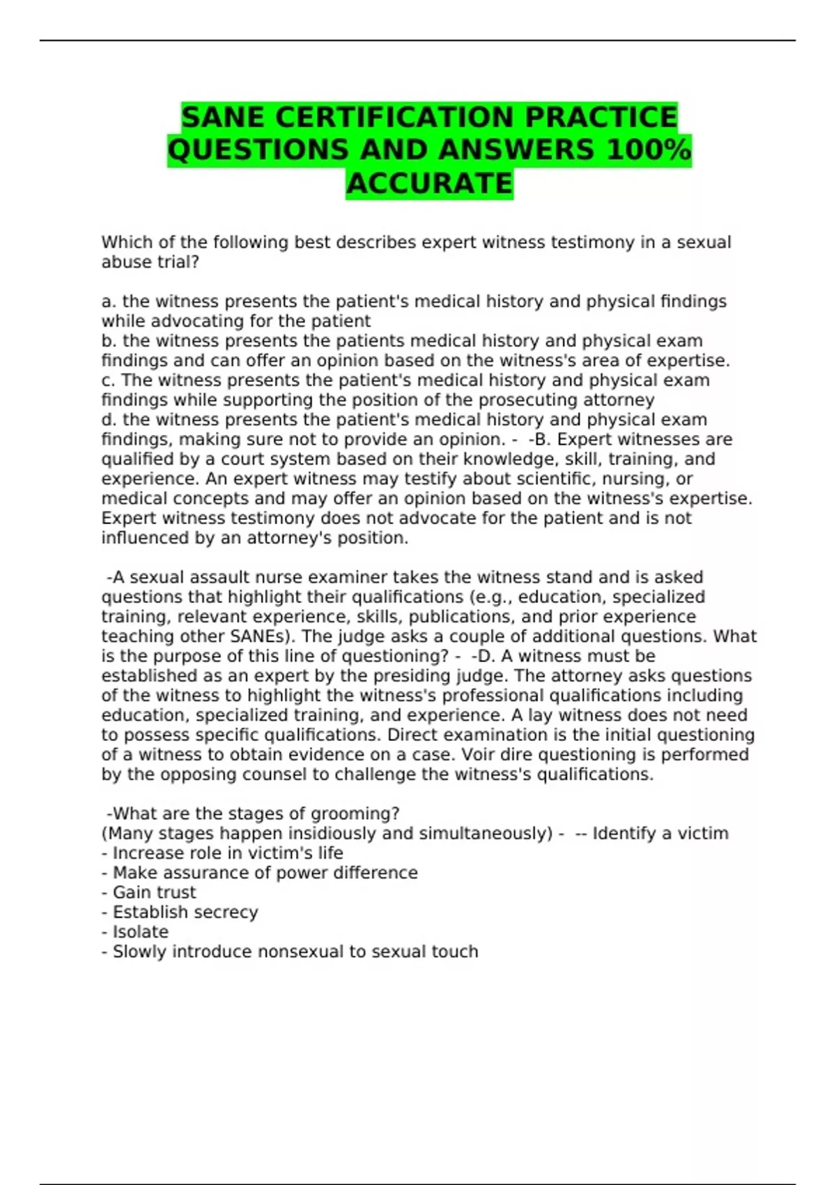 SANE CERTIFICATION PRACTICE QUESTIONS AND ANSWERS 100% CORRECT