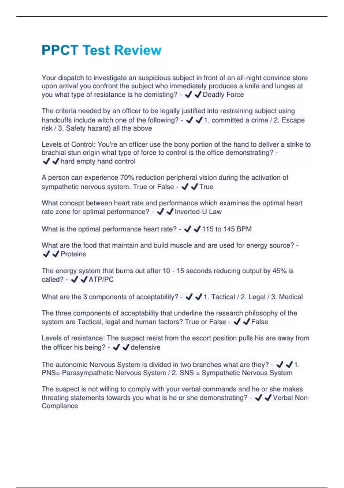 Your dispatch to investigate an suspicious subject in front of an all-night convince store upon arrival you confront the subject who immediately produces a knife and lunges at you what type of resistance is he demisting? - ️️Deadly Force The criteria needed by an officer to be legally justified into restraining subject using handcuffs include witch one of the following? - ️️1. committed a crime / 2. Escape risk / 3. Safety hazard) all the above Levels of Control: You're an officer use the bony portion of the hand to deliver a strike to brachial stun origin what type of force to control is the office demonstrating? - ️️hard empty hand control A person can experience 70% reduction peripheral vision during the activation of sympathetic nervous system. True or False - ️️True What concept between heart rate and performance which examines the optimal heart rate zone for optimal performance? - ️️Inverted-U Law What is the optimal performance heart rate? - ️️115 to 145 BPM What are the food that maintain and build muscle and are used for energy source? - ️️Proteins The energy system that burns out after 10 - 15 seconds reducing output by 45% is called? - ️️ATP/PC What are the 3 components of acceptability? - ️️1. Tactical / 2. Legal / 3. Medical The three components of acceptability that underline the research philosophy of the system are Tactical, legal and human factors? True or False - ️️False Levels of resistance: The suspect resist from the escort position pulls his are away from the officer his being? - ️️defensive The autonomic Nervous System is divided in two branches what are they? - ️️1. PNS= Parasympathetic Nervous System / 2. SNS = Sympathetic Nervous System The suspect is not willing to comply with your verbal commands and he or she makes threating statements towards you what is he or she demonstrating? - ️️Verbal NonComplianceOfficer your called out to an abortion clinic to remove unwanted protesters when you arrive you intent to escort the protester from the premises he or she goes limp dead weight is a demented of ? - ️️Passive resistance Your investigation a complain on an unwanted guest you confront the Subject and assumed a combated stance and glares at you with piercing eyes what is he demonstrating? - ️️Psychological Intimidation You apply a joint lock escort position is what type of control is that? - ️️soft empty hand control An officer uses a baton to deliver a fluid shock wave strike to the Tibial what type of control are you demonstrating? - ️️intermediate weapon An officer tells a subject to step away out of the car what are you doing? - ️️verbal Direction An officer delivers an angel kick to the subject Common Peroneal Nerve Motor Point is what type of control? - ️️hard empty hand control An officer dressed in full uniform arrives at the sense what demonstrating? - ️️Officer Presence For the purpose of officer safety then minimum safe zone that an office maintain is referred to as what? - ️️reactionary gap 6 feet Tactical consideration for handcuffing is approach to is? - ️️ct/ 2. control upon touch / 3. speed and application Officer should always search a subject before handcuffing? True or False - ️️false When handcuffing the first hand of a subject in the prone position what precaution should be taken from preventing the subject form rolling over? - ️️Hand should always be below the knee The subject is being escorted suddenly he locks his arm straight out refusing to continue to go with you what is he demonstration ? - ️️It's a straight arm lock out is a / Straight Armbar Takedown If subject does a cycle resistance what are we doing? - ️️transport wrist lockPressures applied to the back of the index knuckle is what? - ️️transport wrist lock When preforming a joint lock take down the officer should always rotated to level 1? True or False - ️️False / it should be 2 ½ Two methods of application are? - ️️Touch Pressure and Striking Techniques The most applicable control principal in the Infra Orbital what type of control are we demonstrating? - ️️Pain compliance The most applicable control principal for an angle kick to the Common Peroneal Nerve is what type of control? - ️️motor dysfunction Pain resistance if applied to long what can happen? - ️️it can escalate Location behind the base of the ear lobe what is this called? - ️️Mandibular Angle Nerve Pressure Point Location on the side of the neck approximately 3 inches from the base between the two groups of muscle pressure should be applied to the center of the neck is called the? - ️️Brachial Plexus Origin Nerve Pressure Point Location is junction of the trapezius muscles side of the neck the angle the pressure should be towards the floor is what? - ️️Suprascapular Nerve Motor Point