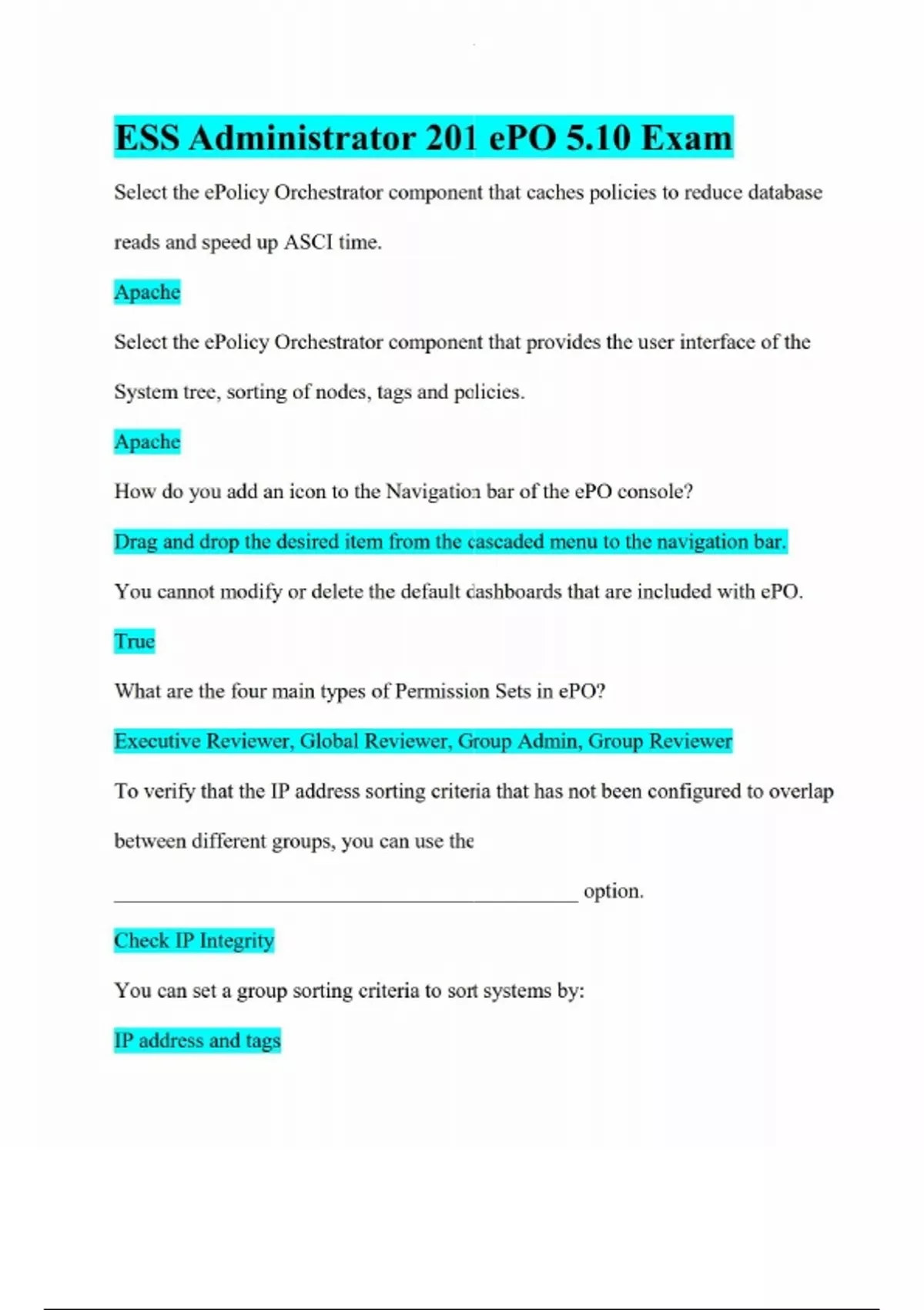 ESS Administrator 201 ePO 5.10 Exam Select the ePolicy Orchestrator component that caches policies to reduce database reads and speed up ASCI time. Apache Select the ePolicy Orchestrator component that provides the user interface of the System tree, sorting of nodes, tags and policies. Apache How do you add an icon to the Navigation bar of the ePO console?