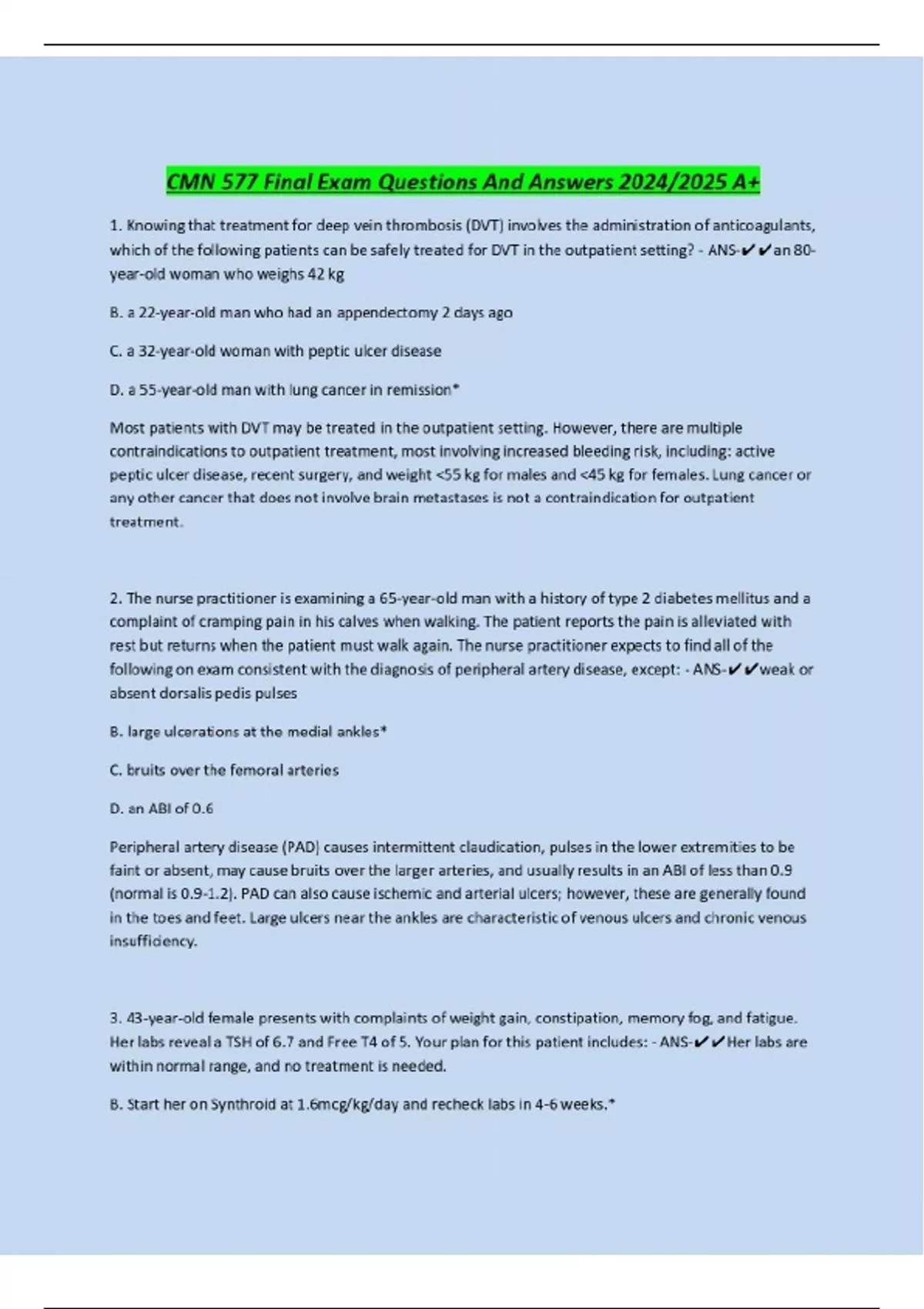 CMN 577 Final Exam Questions And Answers 2024/2025 A+ 1. Knowing that treatment for deep vein thrombosis (DVT) involves the administration of anticoagulants, which of the following patients can be safely treated for DVT in the outpatient setting? - ANS-an 80 year-old woman who weighs 42 kg B. a 22-year-old man who had an appendectomy 2 days ago C. a 32-year-old woman with peptic ulcer disease D. a 55-year-old man with lung cancer in remission* Most patients with DVT may be treated in the outpatient setting. However, there are multiple contraindications to outpatient treatment, most involving increased bleeding risk, including: active peptic ulcer disease, recent surgery, and weight <55 kg for males and <45 kg for females. Lung cancer or any other cancer that does not involve brain metastases is not a contraindication for outpatient treatment. 2. The nurse practitioner is examining a 65-year-old man with a history of type 2 diabetes mellitus and a complaint of cramping pain in his calves when walking. The patient reports the pain is alleviated with rest but returns when the patient must walk again. The nurse practitioner expects to find all of the following on exam consistent with the diagnosis of peripheral artery disease, except: - ANS-weak or absent dorsalis pedis pulses B. large ulcerations at the medial ankles* C. bruits over the femoral arteries D. an ABI of 0.6 Peripheral artery disease (PAD) causes intermittent claudication, pulses in the lower extremities to be faint or absent, may cause bruits over the larger arteries, and usually results in an ABI of less than 0.9 (normal is 0.9-1.2). PAD can also cause ischemic and arterial ulcers; however, these are generally found in the toes and feet. Large ulcers near the ankles are characteristic of venous ulcers and chronic venous insufficiency. 3. 43-year-old female presents with complaints of weight gain, constipation, memory fog, and fatigue. Her labs reveal a TSH of 6.7 and Free T4 of 5. Your plan for this patient includes: - ANS-Her labs are within normal range, and no treatment is needed. B. Start her on Synthroid at 1.6mcg/kg/day and recheck labs in 4-6 weeks.* C. Instruct her to take her Synthroid on a full stomach for best absorption. D. Start her on Synthroid at 0.8mcg/kg/day and recheck labs in 2 weeks. Normal TSH values are 0.4-4 mIU/L and normal FreeT4 is 10-27pmlol/L. This patient has both the symptoms and lab values for hypothyroidism. Synthroid (synthetic levothyroxine) is the first line medication for hypothyroidism and starting dose is 1.6mcg/kg/day based on ideal body weight. TSH and Free T4 should be rechecked every 4-6 weeks until euthyroid and normal lab values should be obtained within 1-2 months of starting therapy. 4. Cigarette smoking may falsely increase the levels of: - ANS-gamma-glutamyl transpeptidase B. sodium and potassium concentrations C. hepatic enzymes* D. serum protein electrophoresis Cigarette smoking may increase hepatic enzymes which in turn will reduce the levels of substances metabolized by the liver such as theophylline. 5. A 75-year-old female patient who is healthy and active reports that she has recently been having trouble getting to the bathroom on time to urinate and also has some leaks when she sneezes or coughs. She reports having to wear an incontinence pad daily. She is very independent and is embarrassed and worried that this is going to affect her lifestyle. As her provider, your best next steps for this patient would be: - ANS-Refer her to urology, her symptoms will only get worse and she will more than likely need surgery B. Suggest bladder training and pelvic floor muscle exercises (Kegel's) to decrease incidences of stress and urge incontinence * C. Prescribe an antimuscarinic agent such as oxybutynin immediately D. Schedule the patient for insertion of a pessary For women with mixed stress/urge incontinence, pelvic floor muscle exercises can be effective for decreasing this problem. The other choices are more invasive and would not be first-line conservative treatments. 6. A 40-year-old female waitress presents to the clinic complaining of pain, burning, and tingling in her hands and fingers. She reports the symptoms are most bothersome at night. The NP has carpal tunnel...