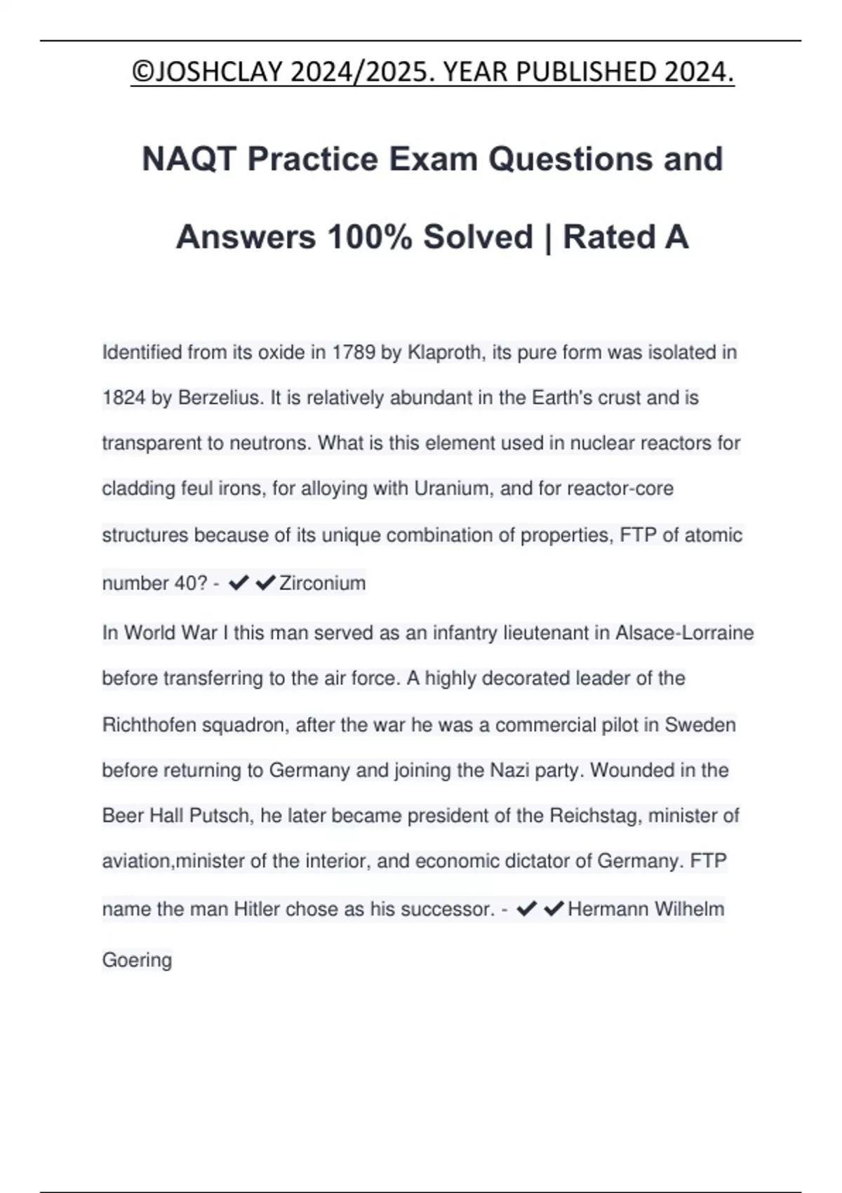 NAQT Practice Exam Questions and Answers 100% Solved | Rated A Identified from its oxide in 1789 by Klaproth, its pure form was isolated in 1824 by Berzelius. It is relatively abundant in the Earth's crust and is transparent to neutrons. What is this element used in nuclear reactors for cladding feul irons, for alloying with Uranium, and for reactor-core structures because of its unique combination of properties, FTP of atomic number 40? - Zirconium In World War I this man served as an infantry lieutenant in Alsace-Lorraine before transferring to the air force. A highly decorated leader of the Richthofen squadron, after the war he was a commercial pilot in Sweden before returning to Germany and joining the Nazi party. Wounded in the Beer Hall Putsch, he later became president of the Reichstag, minister of aviation,minister of the interior, and economic dictator of Germany. FTP name the man Hitler chose as his successor. - Hermann Wilhelm Goering