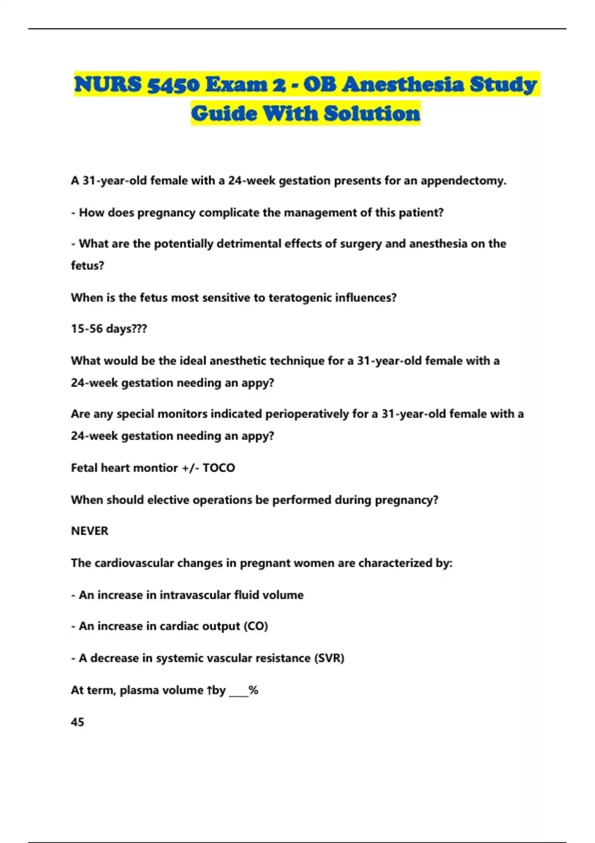 NURS 5450 Exam 2 - OB Anesthesia Study Guide With Solution...