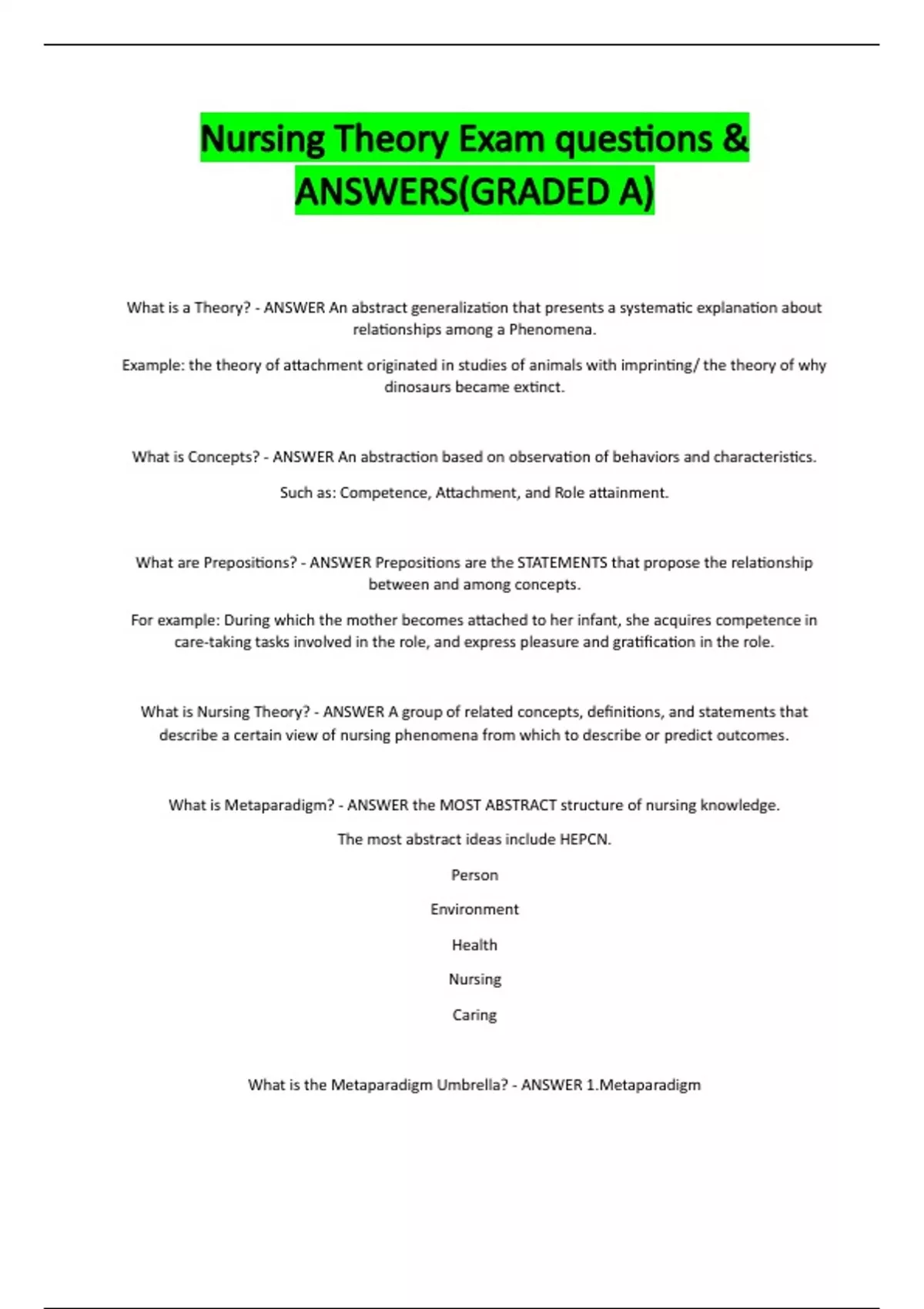What is Metaparadigm? - ANSWER the MOST ABSTRACT structure of nursing knowledge.