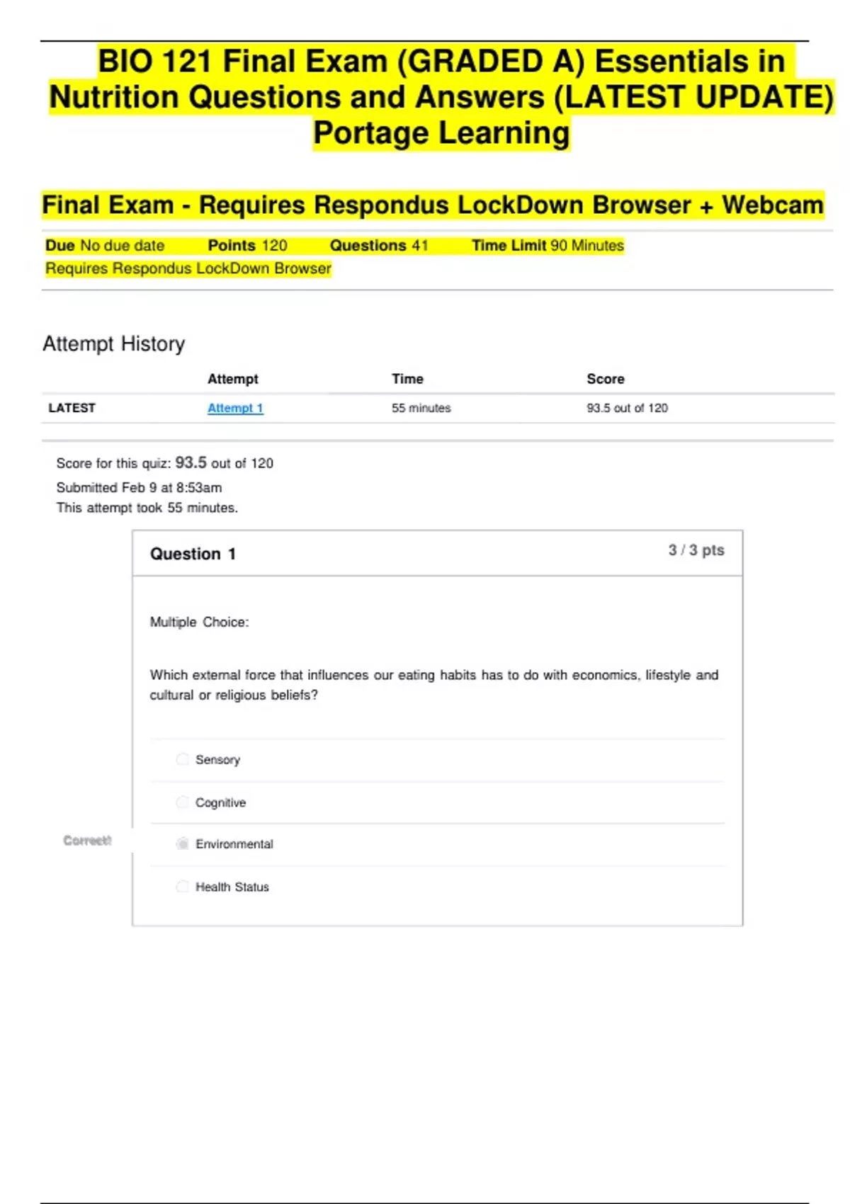 BIO 121 Final Exam (GRADED A) Essentials in Nutrition Questions and Answers (LATEST UPDATE) Portage Learning Final Exam - Requires Respondus LockDown Browser + Webcam Due No due date Points 120 Questions 41 Time Limit 90 Minutes Requires Respondus LockDown Browser Attempt History Attempt Time Score LATEST Attempt 1 55 minutes 93.5 out of 120 Score for this quiz: 93.5 out of 120 Submitted Feb 9 at 8:53am This attempt took 55 minutes.
