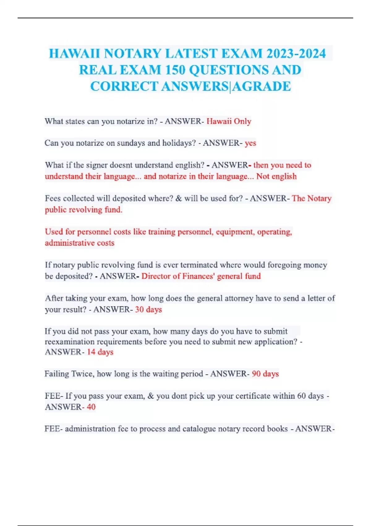 HAWAII NOTARY LATEST EXAM REAL EXAM 150 QUESTIONS AND CORRECT ANSWERSAGRADE