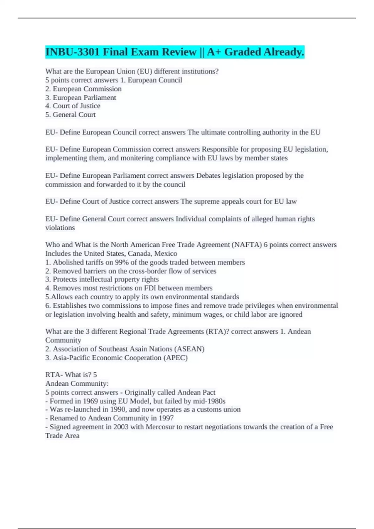 What are the European Union (EU) different institutions? 5 points correct answers 1. European Council 2. European Commission 3. European Parliament 4. Court of Justice 5. General Court EU- Define European Council correct answers The ultimate controlling authority in the EU EU- Define European Commission correct answers Responsible for proposing EU legislation, implementing them, and monitering compliance with EU laws by member states EU- Define European Parliament correct answers Debates legislation proposed by the commission and forwarded to it by the council EU- Define Court of Justice correct answers The supreme appeals court for EU law EU- Define General Court correct answers Individual complaints of alleged human rights violations Who and What is the North American Free Trade Agreement (NAFTA) 6 points correct answers Includes the United States, Canada, Mexico 1. Abolished tariffs on 99% of the goods traded between members 2. Removed barriers on the cross-border flow of services 3. Protects intellectual property rights 4. Removes most restrictions on FDI between members 5.Allows each country to apply its own environmental standards 6. Establishes two commissions to impose fines and remove trade privileges when environmental or legislation involving health and safety, minimum wages, or child labor are ignored What are the 3 different Regional Trade Agreements (RTA)? correct answers 1. Andean Community 2. Association of Southeast Asain Nations (ASEAN) 3. Asia-Pacific Economic Cooperation (APEC) RTA- What is? 5 Andean Community: 5 points correct answers - Originally called Andean Pact - Formed in 1969 using EU Model, but failed by mid-1980s - Was re-launched in 1990, and now operates as a customs union - Renamed to Andean Community in 1997 - Signed agreement in 2003 with Mercosur to restart negotiations towards the creation of a Free Trade Area