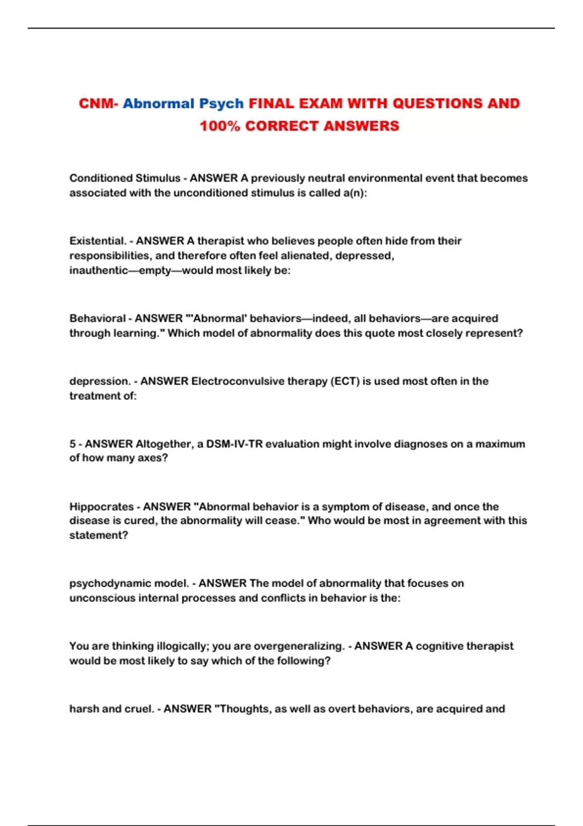 CNM- Abnormal Psych FINAL EXAM WITH QUESTIONS AND 100% CORRECT ANSWERS...