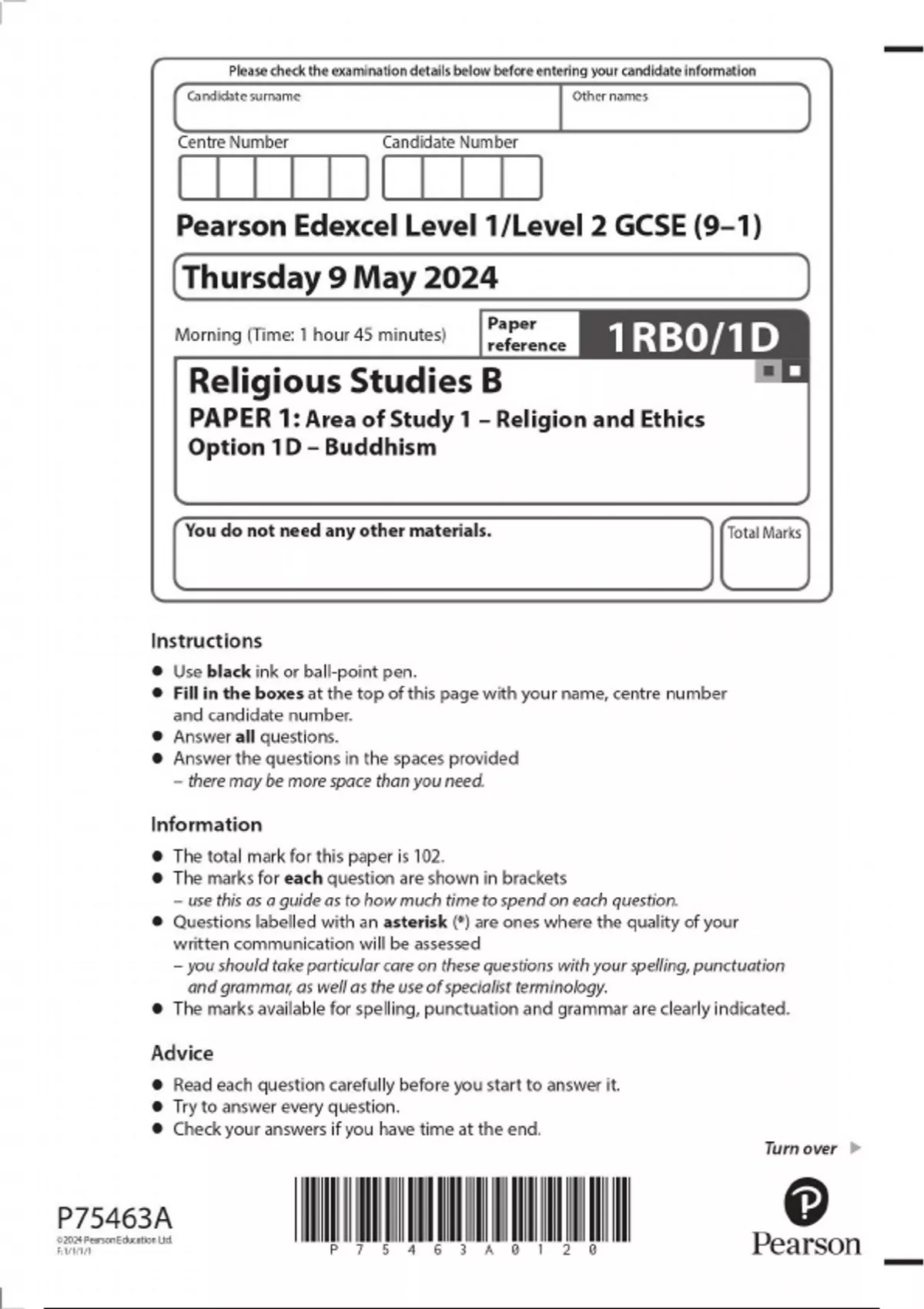2024 EDEXCEL GCSE RELIGIOUS STUDIES B PAPER 1 OPTION 1D: BUDDHISM INCLUDING MARK SCHEME