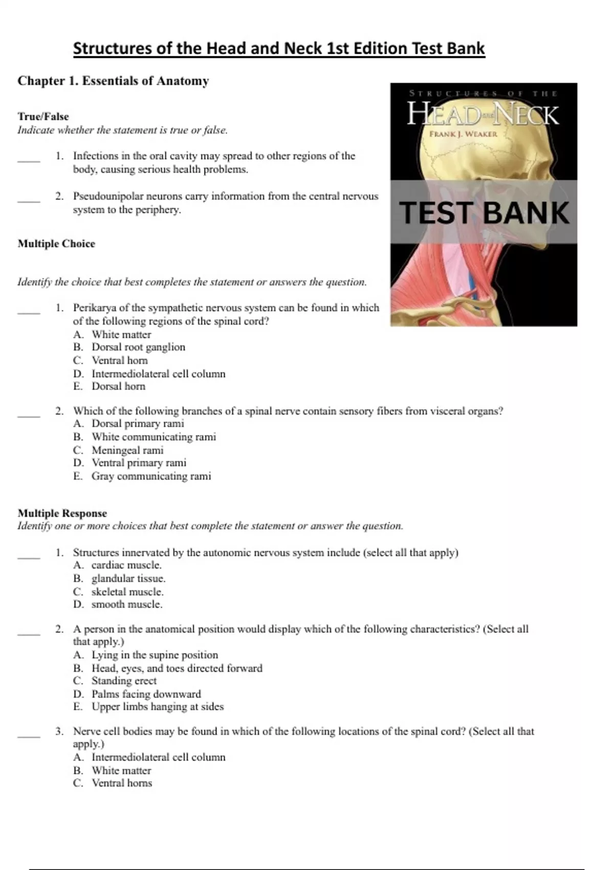 , Structures of the Head and Neck 1st Edition Test Bank