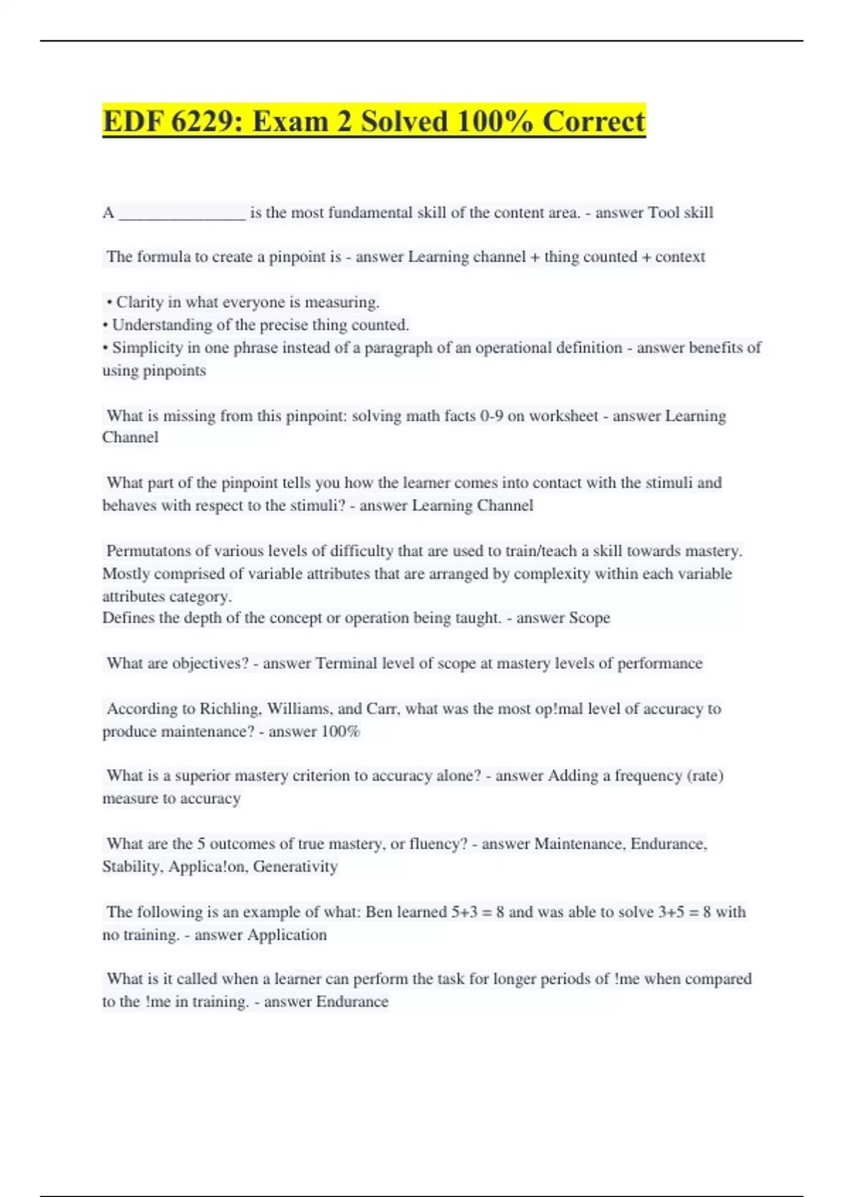 EDF 6229: Exam 2 Solved 100% Correct A _______________ is the most fundamental skill of the content area. - answer Tool skill The formula to create a pinpoint is - answer Learning channel + thing counted + context • Clarity in what everyone is measuring. • Understanding of the precise thing counted. • Simplicity in one phrase instead of a paragraph of an operational definition - answer benefits of using pinpoints What is missing from this pinpoint: solving math facts 0-9 on worksheet - answer Learning Channel What part of the pinpoint tells you how the learner comes into contact with the stimuli and behaves with respect to the stimuli? - answer Learning Channel Permutatons of various levels of difficulty that are used to train/teach a skill towards mastery. Mostly comprised of variable attributes that are arranged by complexity within each variable attributes category. Defines the depth of the concept or operation being taught. - answer Scope What are objectives? - answer Terminal level of scope at mastery levels of performance According to Richling, Williams, and Carr, what was the most op!mal level of accuracy to produce maintenance? - answer 100% What is a superior mastery criterion to accuracy alone? - answer Adding a frequency (rate) measure to accuracy What are the 5 outcomes of true mastery, or fluency? - answer Maintenance, Endurance, Stability, Applica!on, Generativity The following is an example of what: Ben learned 5+3 = 8 and was able to solve 3+5 = 8 with no training. - answer Application What is it called when a learner can perform the task for longer periods of !me when compared to the !me in training. - answer Endurance The following is an example of what: Molly is so good at playing her song on the piano, she doesn't mess up when her li"le sister sits down next to her and starts banging on the piano while she plays. - answer Stability The following is an example of what: Even after 10 years, Vanessa still remembered the dance moves to her highschool performance. - answer Maintenance The following is an example of what: Since the key was lost, Hank used a paperclip to pop the lock on his daughter's bedroom for the first time ever. - answer Generativity As suggested by Binder (1996) and Fabrizio and Moors (2003), the __________ for a skill may predict different fluency outcomes. - answer Aim While there are predicted frequency aims for human behavior, according to Haughton (1972), aims should be _________. - answer Personalized According to T&M's Learning Matrix, knowing the difference between a gas, a solid, and a liquid would fall into what category? - answer Concepts According to T&M's Learning Matrix, reci!ng the "Ge"ysburg Address" would fall into what category? - answer Serial Memory What part of the instruc!onal design method evaluates the star!ng point for the learner? - answer Entry-Level Repertoire What is the preferred method to iden!fy entry-level performance? - answer Assessments via pinpointing According to Twarek, Cihon, and Eshleman (2010), if a learner comes in with an entry-level repertoire of not being able to zip up a jacket, !e shoes, and other ac!vi!es of daily living (ADLs), the therapist should work on the following skills: - answer Big 6 + 6 Kubina, Morrison, and Lee (2002) define Precision Teaching as: - answer An overlay procedure that complements existing curricula with a set of systematic procedures for measuring behavior and facilitating decision-making What is NOT a characteris!c of direct instruc!on? - answer Going as fast as you can What is not a phase to test performance data: - answer Beta Testing The difference(s) between a cri!cal attribute and a variable attribute is/are - answer A change in cri!cal attributes results in a different skill; a change in variable attributes produces a new example. The difference(s) between a variable attribute and an uncontrolled attribute is/are: - answer Variable attributes are purposefully manipulated, shaping the skill towards mastery. Uncontrolled a"ributes should always be randomly presented to avoid faulty s!mulus control. When teaching a learner how to write their name, you are teaching them an operation. - answer True Teaching the name of something is to teach a/an - answer Concept Which one is not a formal step in Instructional Design: - answer Mastery Goals A component skill is made up of multiple composite skills. - answer False What is the goal for development tes!ng? - answer To generate a workable instruc!onal program What three things do you monitor/analyze on any graph at any !me, especially for performance data tes!ng? - answer Level, Trend, Variability When evaluating level, what are you looking for? - answer Frequency level compared to the aim When evalua!ng trend, what are you looking for? - answer A bettering picture with celeration value When evalua!ng variability, what are you looking for? - answer Low variability across the trend line "Take-off" is an example of a ______ learning picture. - answer Bettering "Snowplow" is an example of a ______ learning picture. - answer Worsening What are the 3 decisions you can make when evalua!ng data? - answer Stay, stop, change What kind of change decision is this: adding a priming before the !med prac!ce. - answer Antecedent