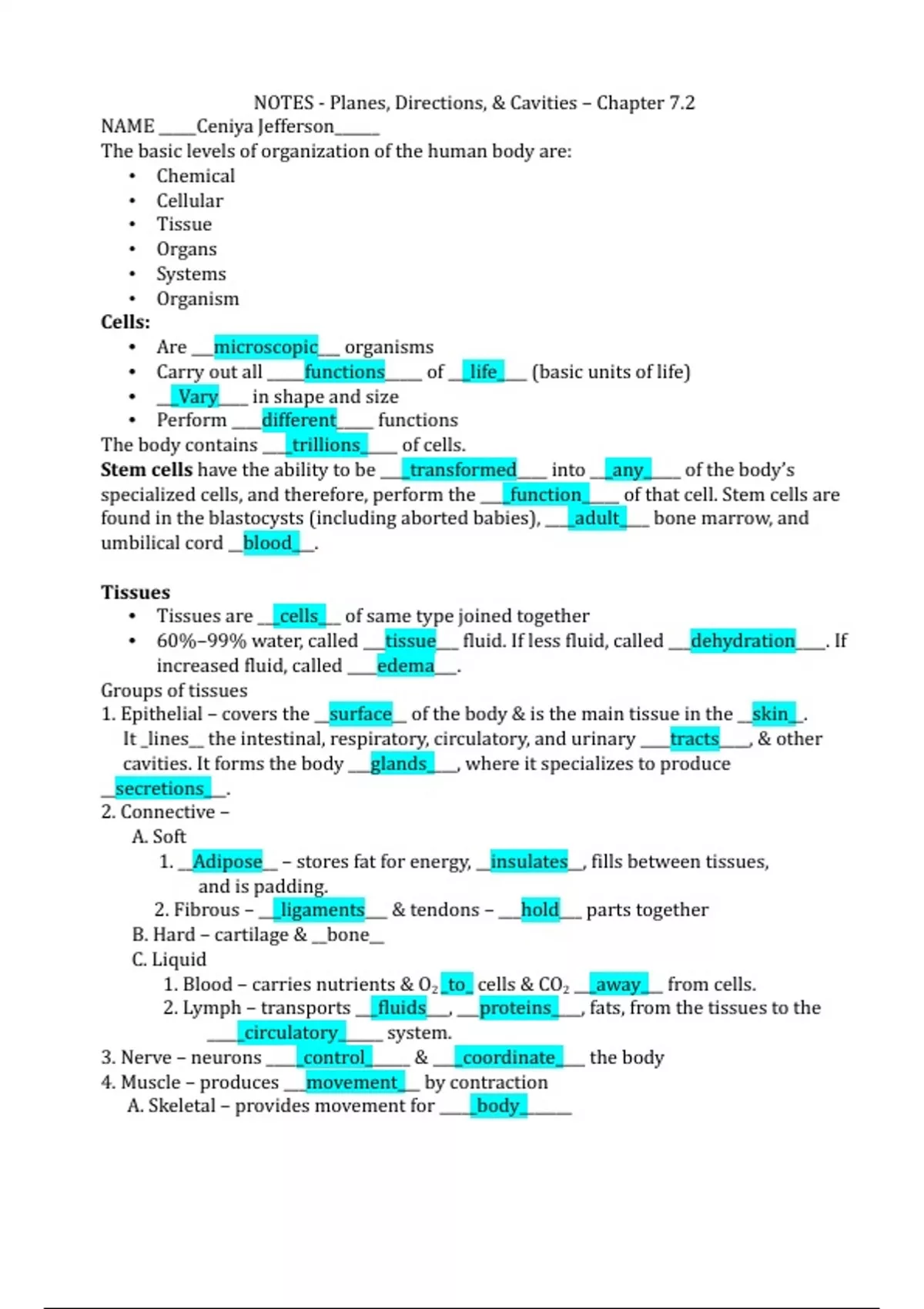1. Blood – carries nutrients & O2 _to_ cells & CO2 ___away___ from cells.