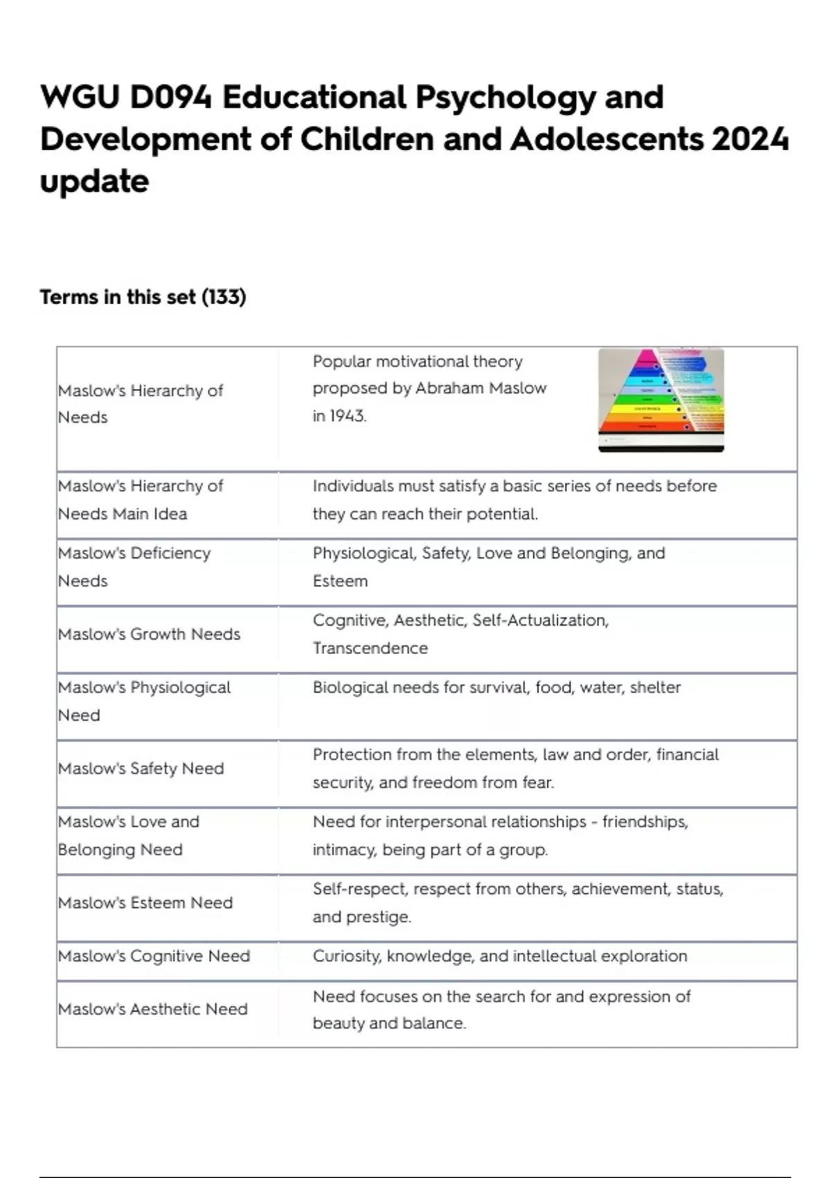 WGU D094 Educational Psychology and Development of Children and Adolescents 2024 update