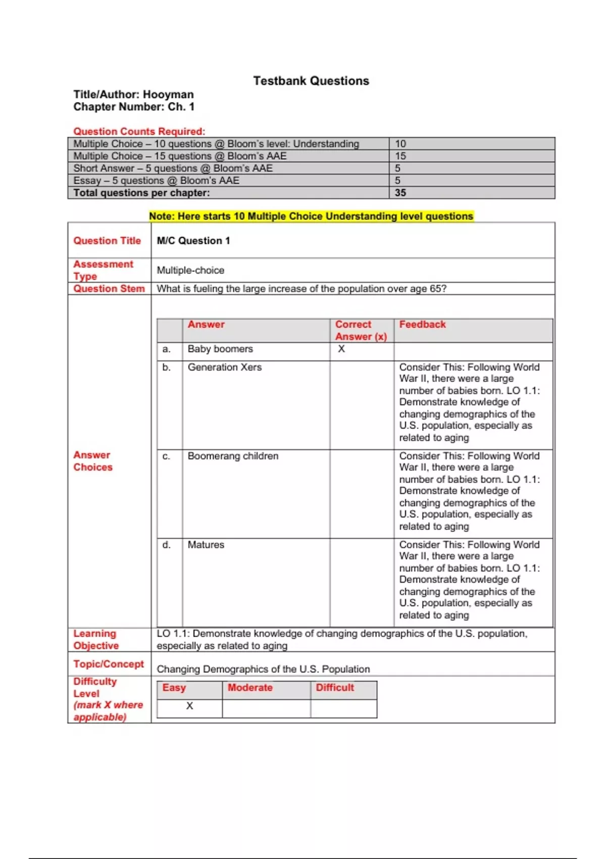 Multiple Choice – 10 questions @ Bloom’s level: Understanding 10