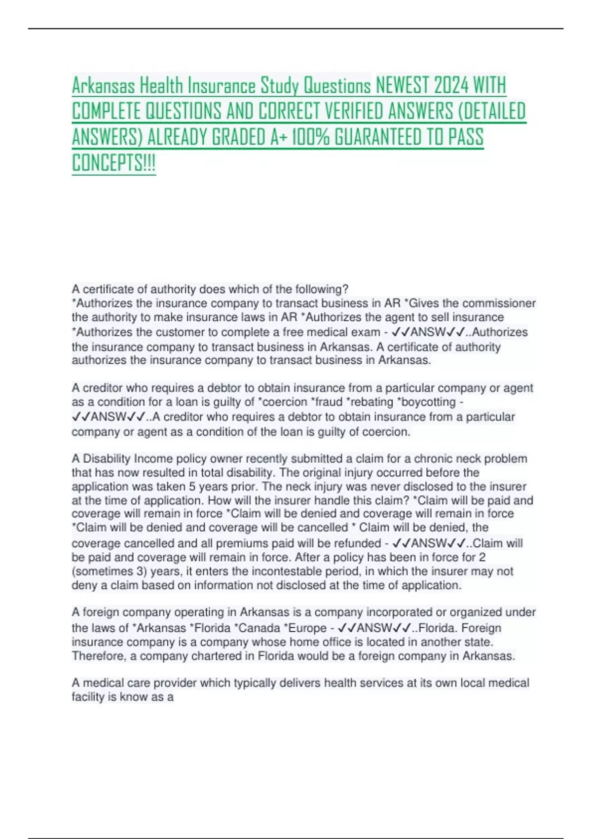 Arkansas Health Insurance Study Questions NEWEST 2024 WITH COMPLETE QUESTIONS AND CORRECT VERIFIED ANSWERS (DETAILED ANSWERS) ALREADY GRADED A+ 100% GUARANTEED TO PASS CONCEPTS!!! A certificate of authority does which of the following? *Authorizes the insurance company to transact business in AR *Gives the commissioner the authority to make insurance laws in AR *Authorizes the agent to sell insurance *Authorizes the customer to complete a free medical exam - ANSW..Authorizes the insurance company to transact business in Arkansas. A certificate of authority authorizes the insurance company to transact business in Arkansas
