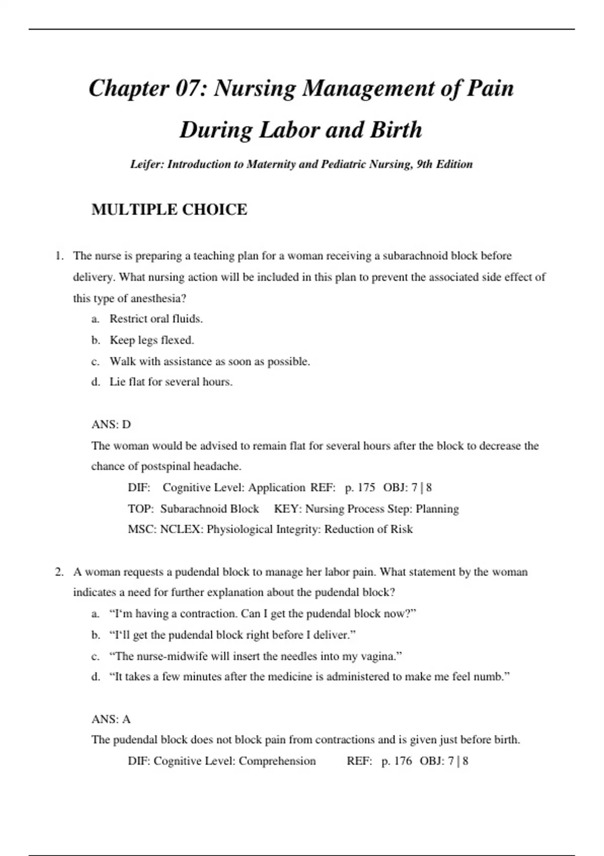 MULTIPLE CHOICE 1. The nurse is preparing a teaching plan for a woman receiving a subarachnoid block before delivery. What nursing action will be included in this plan to prevent the associated side effect of this type of anesthesia? a. Restrict oral fluids. b. Keep legs flexed. c. Walk with assistance as soon as possible. d. Lie flat for several hours. ANS: D The woman would be advised to remain flat for several hours after the block to decrease the chance of postspinal headache. DIF: Cognitive Level: Application REF: p. 175 OBJ: 7 | 8 TOP: Subarachnoid Block KEY: Nursing Process Step: Planning MSC: NCLEX: Physiological Integrity: Reduction of Risk 2. A woman requests a pudendal block to manage her labor pain. What statement by the woman indicates a need for further explanation about the pudendal block? a. “I‘m having a contraction. Can I get the pudendal block now?” b. “I‘ll get the pudendal block right before I deliver.” c. “The nurse-midwife will insert the needles into my vagina.” d. “It takes a few minutes after the medicine is administered to make me feel numb.” ANS: A The pudendal block does not block pain from contractions and is given just before birth. DIF: Cognitive Level: Comprehension REF: p. 176 OBJ: 7 | 8 TOP: Pudendal Block KEY: Nursing Process Step: Evaluation MSC: NCLEX: Physiological Integrity: Basic Care and Comfort 3. An 18-year-old primigravida is 4 cm dilated and her contractions are 5 minutes apart. She received little prenatal care and had no childbirth preparation. She is crying loudly and shouting, “Please give me something for the pain. I can‘t take the pain!” What is the priority nursing diagnosis? a. Pain related to uterine contractions b. Knowledge deficit related to the birth experience c. Ineffective coping related to inadequate preparation for labor d. Risk for injury related to lack of prenatal care