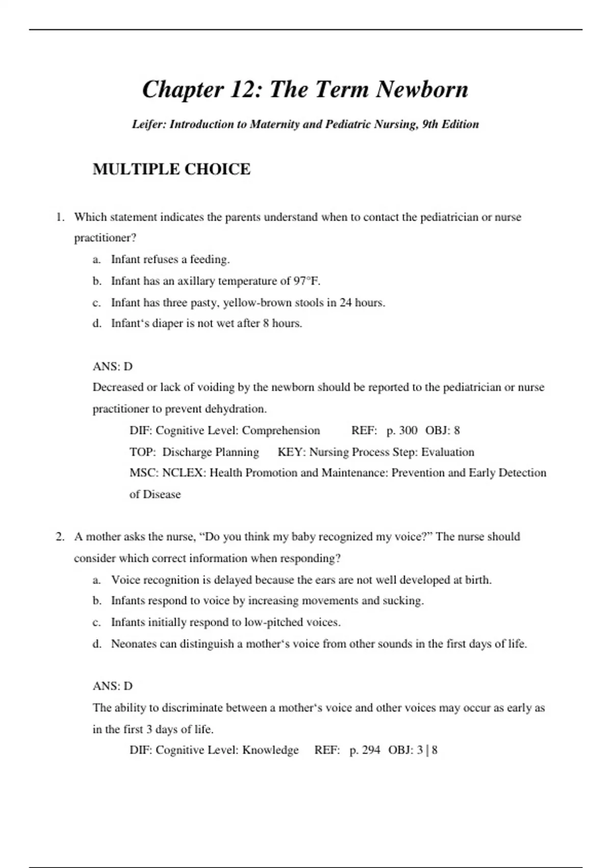 MULTIPLE CHOICE 1. Which statement indicates the parents understand when to contact the pediatrician or nurse practitioner? a. Infant refuses a feeding. b. Infant has an axillary temperature of 97°F. c. Infant has three pasty, yellow-brown stools in 24 hours. d. Infant‘s diaper is not wet after 8 hours. ANS: D Decreased or lack of voiding by the newborn should be reported to the pediatrician or nurse practitioner to prevent dehydration. DIF: Cognitive Level: Comprehension REF: p. 300 OBJ: 8 TOP: Discharge Planning KEY: Nursing Process Step: Evaluation MSC: NCLEX: Health Promotion and Maintenance: Prevention and Early Detection of Disease 2. A mother asks the nurse, “Do you think my baby recognized my voice?” The nurse should consider which correct information when responding? a. Voice recognition is delayed because the ears are not well developed at birth. b. Infants respond to voice by increasing movements and sucking. c. Infants initially respond to low-pitched voices. d. Neonates can distinguish a mother‘s voice from other sounds in the first days of life. ANS: D The ability to discriminate between a mother‘s voice and other voices may occur as early as in the first 3 days of life. DIF: Cognitive Level: Knowledge REF: p. 294 OBJ: 3 | 8 TOP: Newborn Assessment—Hearing KEY: Nursing Process Step: Implementation MSC: NCLEX: Health Promotion and Maintenance: Growth and Development 3. The nurse compared the birth weight of a 3-day-old with her current weight and determined the infant had lost weight. What is the most appropriate intervention by the nurse? a. Do nothing because this is a normal occurrence. b. Report the discrepancy to the pediatrician immediately. c. Decrease the interval between the infant‘s feedings. d. Try feeding the infant a different type of formula.