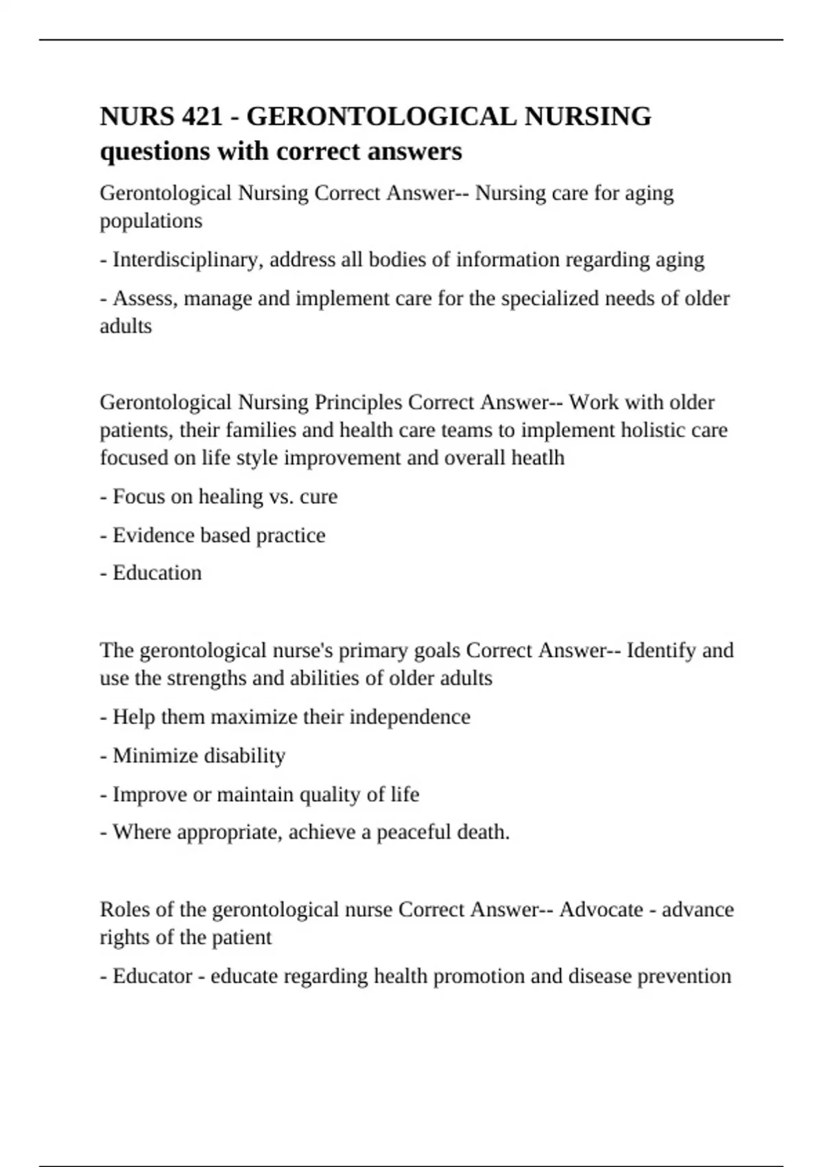 Gerontological Nursing Correct Answer-- Nursing care for aging populations - Interdisciplinary, address all bodies of information regarding aging - Assess, manage and implement care for the specialized needs of older adults Gerontological Nursing Principles Correct Answer-- Work with older patients, their families and health care teams to implement holistic care focused on life style improvement and overall heatlh - Focus on healing vs. cure - Evidence based practice - Education The gerontological nurse's primary goals Correct Answer-- Identify and use the strengths and abilities of older adults - Help them maximize their independence - Minimize disability - Improve or maintain quality of life - Where appropriate, achieve a peaceful death. Roles of the gerontological nurse Correct Answer-- Advocate - advance rights of the patient - Educator - educate regarding health