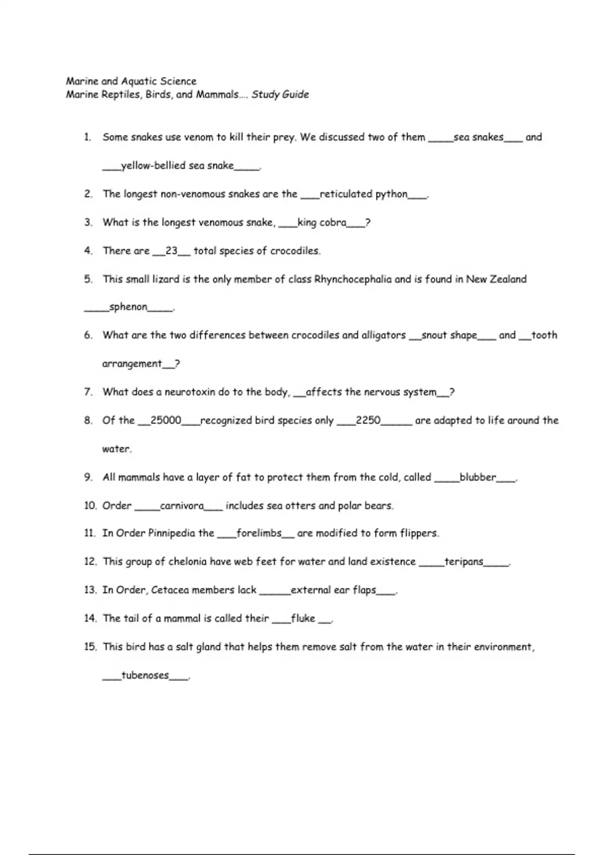 Marine Reptiles, Birds, and Mammals…. Study Guide