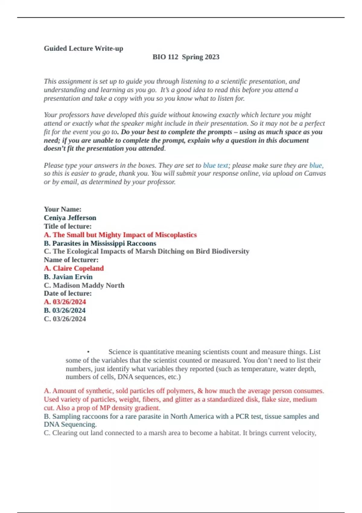 This Guided Lecture Write-Up highlights the impacts of microplastics, parasites in the Mississippi River, and marsh ditching on bird biodiversity. Microplastics: It discusses their sources and harmful effects on aquatic organisms and ecosystems. Parasites: The lecture examines how parasites affect fish populations in the Mississippi River, exacerbated by pollution and habitat degradation. Marsh Ditching: It addresses how this practice alters habitats, leading to declines in bird biodiversity. Overall, the lecture emphasizes the interconnectedness of these issues and the need for conservation efforts to protect aquatic ecosystems.