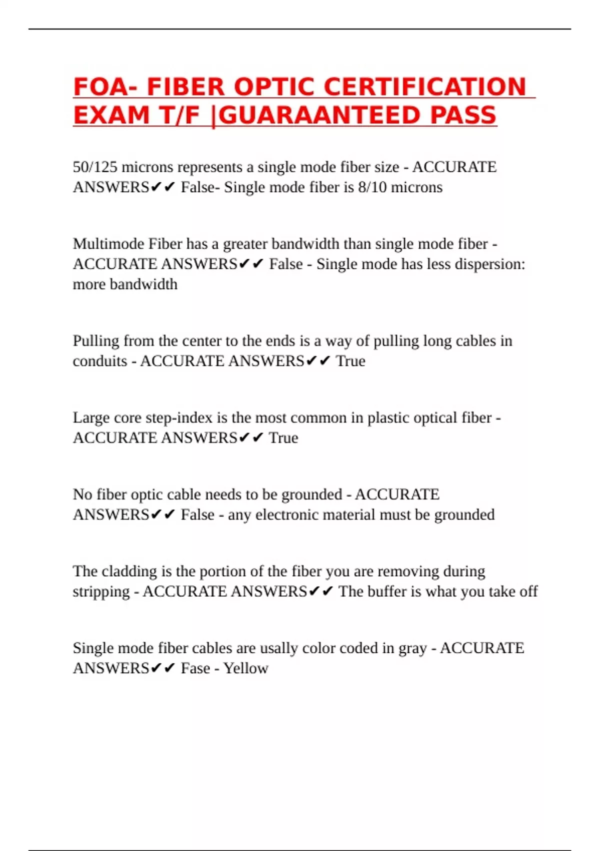 ANSWERS✔✔ False- Single mode fiber is 8/10 microns