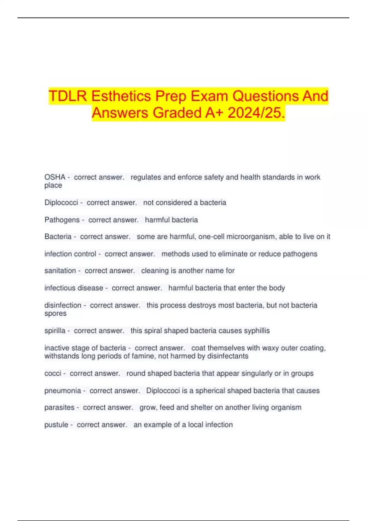 TDLR Esthetics Prep Exam Questions And Answers Graded A+ 2024/25. OSHA - correct answer. regulates and enforce safety and health standards in work place Diplococci - correct answer. not considered a bacteria Pathogens - correct answer. harmful bacteria Bacteria - correct answer. some are harmful, one-cell microorganism, able to live on it infection control - correct answer. methods used to eliminate or reduce pathogens sanitation - correct answer. cleaning is another name for infectious disease - correct answer. harmful bacteria that enter the body disinfection - correct answer. this process destroys most bacteria, but not bacteria spores spirilla - correct answer. this spiral shaped bacteria causes syphillis inactive stage of bacteria - correct answer. coat themselves with waxy outer coating, withstands long periods of famine, not harmed by disinfectants cocci - correct answer. round shaped bacteria that appear singularly or in groups pneumonia - correct answer. Diploccoci is a spherical shaped bacteria that causes parasites - correct answer. grow, feed and shelter on another living organism pustule - correct answer. an example of a local infection inflammation - correct answer. redness, heat, pain and swelling white blood cells, bacteria and dead cells - correct answer. contaminants in pus bacilli - correct answer. common bacteria that affects humans HIV/AIDS and Hepatitis - correct answer. bloodborne pathogens viruses differ from bacteria by - correct answer. the live and reproduce by taking over other cells virus - correct answer. parasitic submicroscopic particle that infects and resides in the cells of a biological organism communicable - correct answer. contagious disease spreads from one person to another plantar warts - correct answer. Human Papillomavirus is the technical name for liver - correct answer. Hepatitis affects which body organ universal precaution - correct answer. assume that all human blood is contaminated antiseptics - correct answer. germicides formulated for use on skin and are registered by the FDA cross contamination - correct answer. touch skin and then an object without cleaning hands chelating detergents - correct answer. break down stubborn films and remove residue of products sterilization - correct answer. highest level of decontamination autoclave - correct answer. apparatus or tool used to sterilize metal implements sodium hypochlorite - correct answer. technical name for bleach phenolic disinfectants - correct answer. disinfectants that are high in pH and can damage the skin and eyes conjunctivitis - correct answer. technical term for pink eye folliculitis - correct answer. bacterial infection or ingrown hair due to shaving cocci - correct answer. bacteria that shows little or no motility