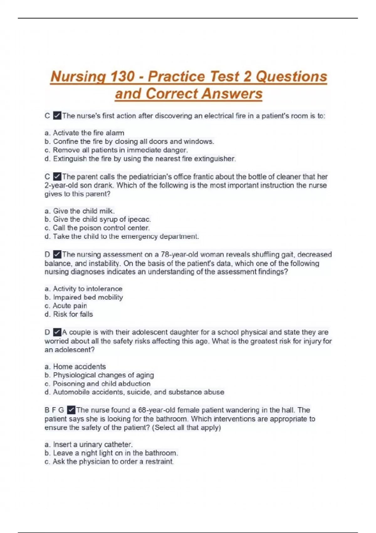 C The nurse's first action after discovering an electrical fire in a patient's room is to: a. Activate the fire alarm b. Confine the fire by closing all doors and windows. c. Remove all patients in immediate danger. d. Extinguish the fire by using the nearest fire extinguisher. C The parent calls the pediatrician's office frantic about the bottle of cleaner that her 2-year-old son drank. Which of the following is the most important instruction the nurse gives to this parent? a. Give the child milk. b. Give the child syrup of ipecac. c. Call the poison control center. d. Take the child to the emergency department. D The nursing assessment on a 78-year-old woman reveals shuffling gait, decreased balance, and instability. On the basis of the patient's data, which one of the following nursing diagnoses indicates an understanding of the assessment findings? a. Activity to intolerance b. Impaired bed mobility c. Acute pain d. Risk for falls D A couple is with their adolescent daughter for a school physical and state they are worried about all the safety risks affecting this age. What is the greatest risk for injury for an adolescent? a. Home accidents b. Physiological changes of aging c. Poisoning and child abduction d. Automobile accidents, suicide, and substance abuse B F G The nurse found a 68-year-old female patient wandering in the hall. The patient says she is looking for the bathroom. Which interventions are appropriate to ensure the safety of the patient? (Select all that apply) a. Insert a urinary catheter. b. Leave a night light on in the bathroom. c. Ask the physician to order a restraint. d. Keep the bed in low position with upper and lower side rails up. e. Assign a staff member to stay with the patient. f. Provide scheduled toileting during the night shift. g. Keep the pathway from the bed to the bathroom clear. C D F The family of a patient who is confused and ambulatory insists that all four side rails be up when the patient is alone. What is the best action to take in this situation? (Select 3) a. Contact the nursing supervisor. b. Restrict the family's visiting privileges. c. Ask the family to stay with the patient if possible. d. Inform the family of the risks associated with side-rail use. e. Thank the family for being conscientious and put the four rails up. f. Discuss alternatives with the family that are appropriate for this patient.