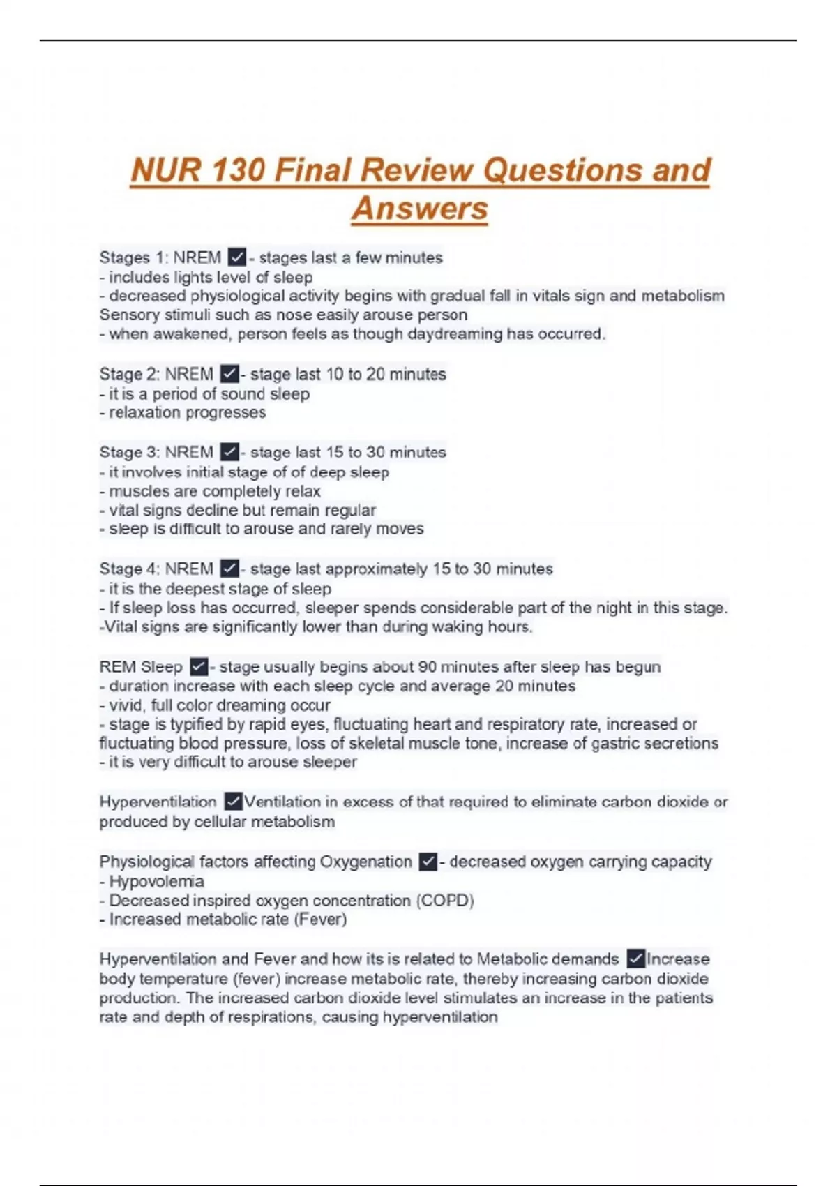 Stages 1: NREM - stages last a few minutes - includes lights level of sleep - decreased physiological activity begins with gradual fall in vitals sign and metabolism Sensory stimuli such as nose easily arouse person - when awakened, person feels as though daydreaming has occurred. Stage 2: NREM - stage last 10 to 20 minutes - it is a period of sound sleep - relaxation progresses Stage 3: NREM - stage last 15 to 30 minutes - it involves initial stage of of deep sleep - muscles are completely relax - vital signs decline but remain regular - sleep is difficult to arouse and rarely moves Stage 4: NREM - stage last approximately 15 to 30 minutes - it is the deepest stage of sleep - If sleep loss has occurred, sleeper spends considerable part of the night in this stage. -Vital signs are significantly lower than during waking hours. REM Sleep - stage usually begins about 90 minutes after sleep has begun - duration increase with each sleep cycle and average 20 minutes - vivid, full color dreaming occur - stage is typified by rapid eyes, fluctuating heart and respiratory rate, increased or fluctuating blood pressure, loss of skeletal muscle tone, increase of gastric secretions - it is very difficult to arouse sleeper Hyperventilation Ventilation in excess of that required to eliminate carbon dioxide or produced by cellular metabolism Physiological factors affecting Oxygenation - decreased oxygen carrying capacity - Hypovolemia - Decreased inspired oxygen concentration (COPD) - Increased metabolic rate (Fever) Hyperventilation and Fever and how its is related to Metabolic demands Increase body temperature (fever) increase metabolic rate, thereby increasing carbon dioxide production. The increased carbon dioxide level stimulates an increase in the patients rate and depth of respirations, causing hyperventilation The most effective way to control transmission of infection Hand Hygiene A patient diagnosed with methicillin-resistant staph aureus (MRSA) Pneumonia, what type of isolation precaution is appropriate? Droplet precautions Pain evaluation includes measuring the changing character of pain, the patients response to interventions, and his or her perception of the effectiveness of a therapy. How to promote sleep and health promotions for sleep **Daily activities, no sugar before bed - environmental control (nosies, temperature, lighting - promoting bedtime routes - promoting safety - promoting comfort - establishing periods of rest and sleep - stress reduction - bedtime snacks - pharmacological approaches Pressure ulcer classifications - stage 1: no open areas - stage 2: partial thickness skin loss - stage 3: full thickness skin loss that may extend to underlying fascia - stage 4: full thickness skin loss damage to muscle, bone or supporting structures. Furosemide (Lasix) is by far the most commonly used loop diuretic in clinical practice and the prototypical drug in this class. It is used in management of pulmonary edema and the edema associated with heart failure, liver disease, nephrotic syndrome, and ascites. It has also been used in the treatment of hypertension, usually that caused by heart failure. Furosemide