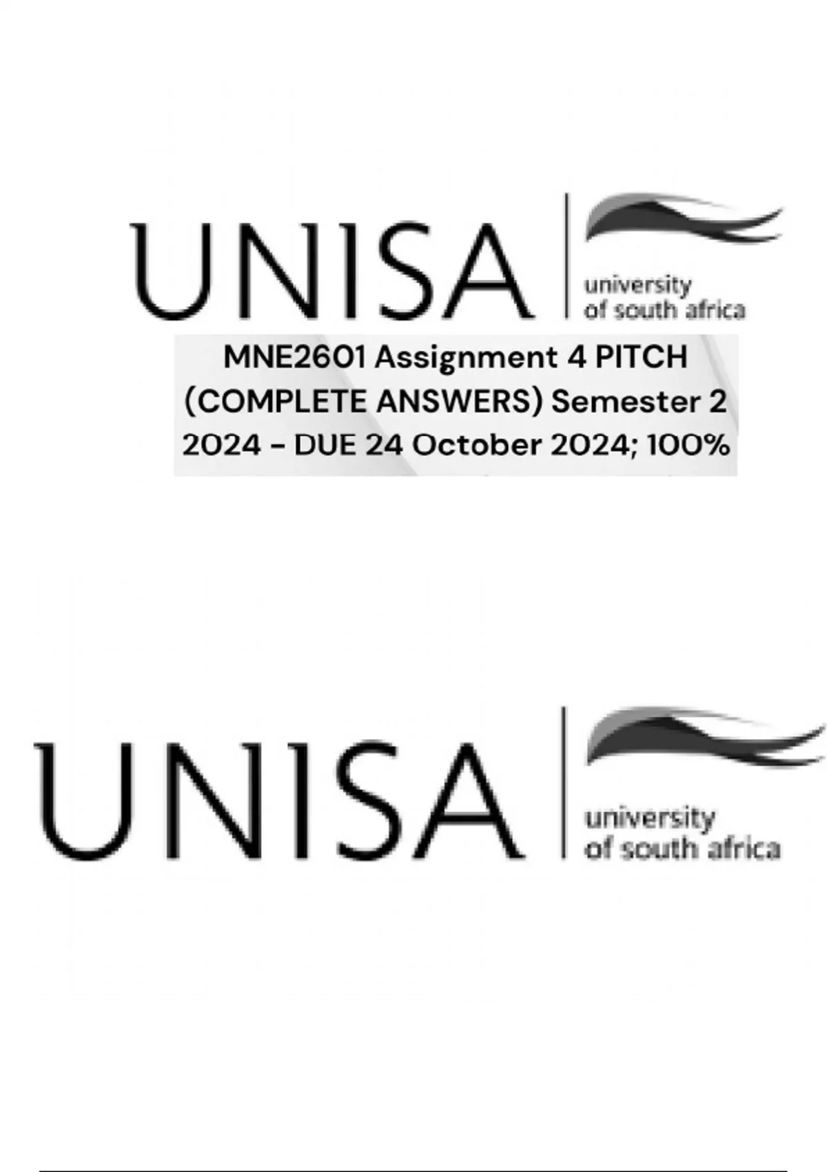MNE2601 Assignment 4 PITCH (COMPLETE ANSWERS) Semester 2 2024 - DUE 24 October 2024; 100% TRUSTED Complete, trusted solutions and explanations Course Introduction to Entrepreneurship and Small business Institution University Of South Africa Book Business Management for Entrepreneurs