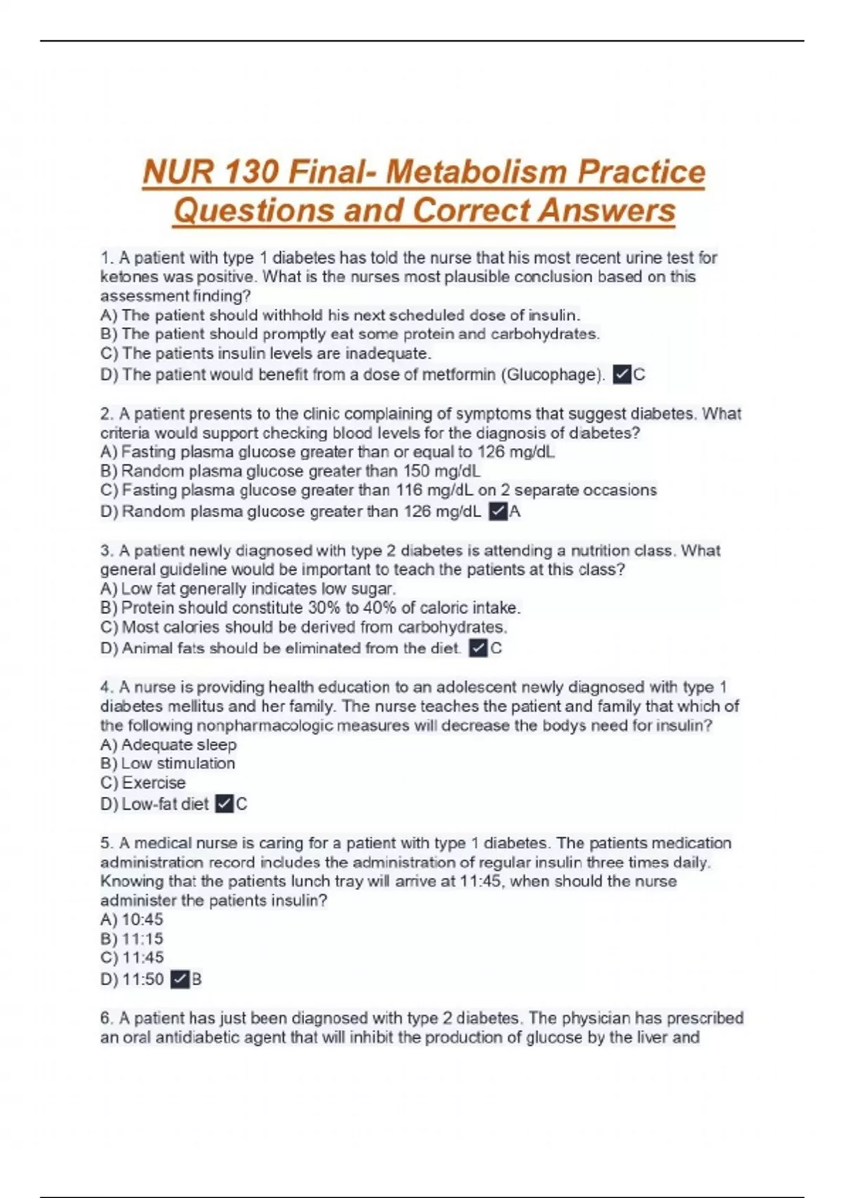 NUR 130 Final- Metabolism Practice Questions and Correct Answers