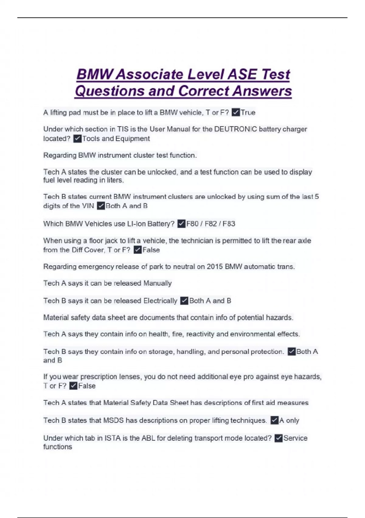 A lifting pad must be in place to lift a BMW vehicle, T or F? True Under which section in TIS is the User Manual for the DEUTRONIC battery charger located? Tools and Equipment Regarding BMW instrument cluster test function. Tech A states the cluster can be unlocked, and a test function can be used to display fuel level reading in liters. Tech B states current BMW instrument clusters are unlocked by using sum of the last 5 digits of the VIN Both A and B Which BMW Vehicles use LI-Ion Battery? F80 / F82 / F83 When using a floor jack to lift a vehicle, the technician is permitted to lift the rear axle from the Diff Cover, T or F? False Regarding emergency release of park to neutral on 2015 BMW automatic trans. Tech A says it can be released Manually Tech B says it can be released Electrically Both A and B Material safety data sheet are documents that contain info of potential hazards. Tech A says they contain info on health, fire, reactivity and environmental effects. Tech B says they contain info on storage, handling, and personal protection. Both A and B If you wear prescription lenses, you do not need additional eye pro against eye hazards, T or F? False Tech A states that Material Safety Data Sheet has descriptions of first aid measures Tech B states that MSDS has descriptions on proper lifting techniques. A only Under which tab in ISTA is the ABL for deleting transport mode located? Service functions