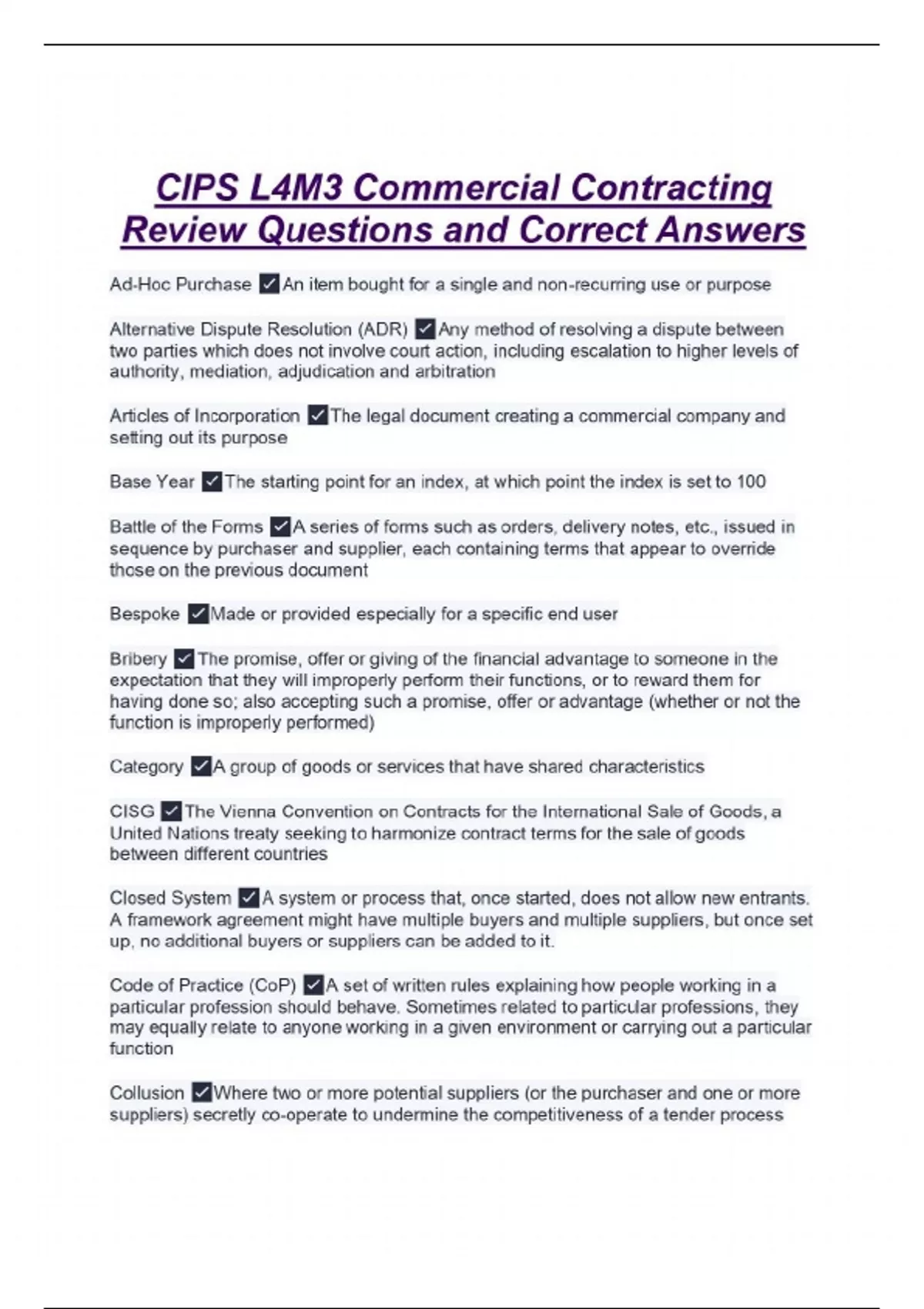 CIPS L4M3 Commercial Contracting Review Questions and Correct Answers