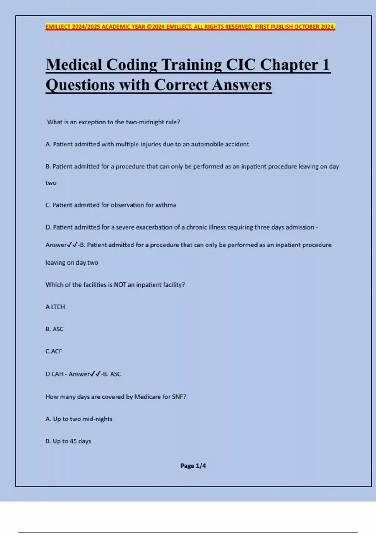 Medical Coding Training CIC Chapter 1 Questions with Correct Answers What is an exception to the two-midnight rule? A. Patient admitted with multiple injuries due to an automobile accident B. Patient admitted for a procedure that can only be performed as an inpatient procedure leaving on day two C. Patient admitted for observation for asthma D. Patient admitted for a severe exacerbation of a chronic illness requiring three days admission - Answer-B. Patient admitted for a procedure that can only be performed as an inpatient procedure leaving on day two Which of the facilities is NOT an inpatient facility? A LTCH B. ASC C.ACF D CAH - Answer-B. ASC How many days are covered by Medicare for SNF? A. Up to two mid-nights B. Up to 45 days EMILLECT 2024/2025 ACADEMIC YEAR ©2024 EMILLECT. ALL RIGHTS RESERVED. FIRST PUBLISH OCTOBER 2024. Page 2/4 C. Up to 60 days D. Up to 100 days - Answer-D. Up to 100 days What is the average LOS in LTCH? A. Greater than 10 days B. Greater than 5 days C. Greater than 20 days D. Greater than 25 days - Answer-D. Greater than 25 days Which services are covered under Medicare Part A? A. Hospice services B. ASC C.Partial hospitalization D. Inpatient services performed by physicians - Answer-A. Hospice services Which services are considered included for inpatient services? I.Nursing care II. Physician services III. Post discharge skilled nursing care IV. Medications V. Medical social services EMILLECT 2024/2025 ACADEMIC YEAR ©2024 EMILLECT. ALL RIGHTS RESERVED. FIRST PUBLISH OCTOBER 2024. Page 3/4 A. I, II, IV B. I, IV, V C. II, III, IV D. All of the above - Answer-B. I, IV, V An inpatient admission begins: A. When the patient is triaged B. When the patient is registered C. When the physician writes the order D. When medical treatment begins - Answer-C. When the physician writes the order Which payment methodology is used for IFS?