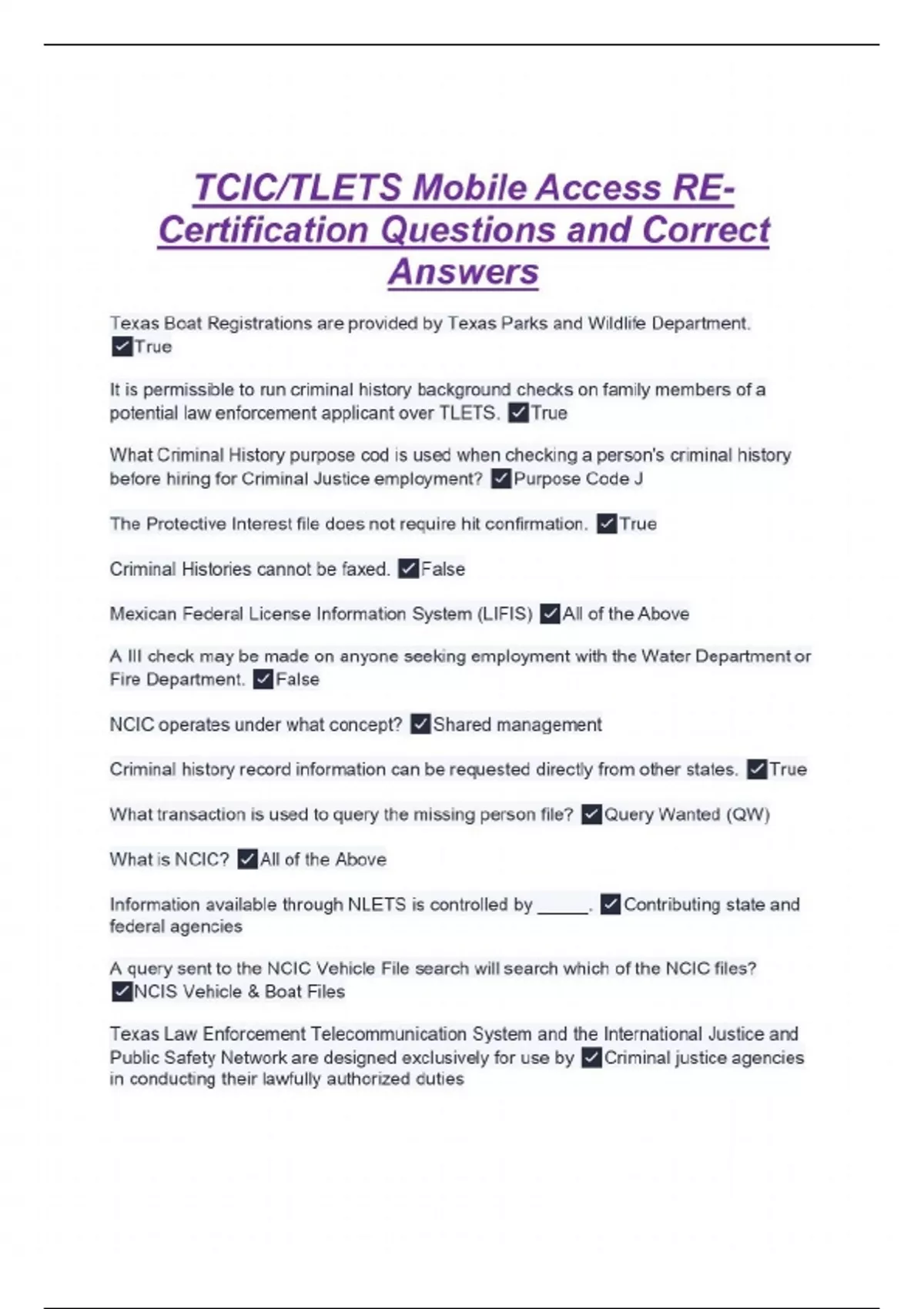 Texas Boat Registrations are provided by Texas Parks and Wildlife Department. True It is permissible to run criminal history background checks on family members of a potential law enforcement applicant over TLETS. True What Criminal History purpose cod is used when checking a person's criminal history before hiring for Criminal Justice employment? Purpose Code J The Protective Interest file does not require hit confirmation. True Criminal Histories cannot be faxed. False Mexican Federal License Information System (LIFIS) All of the Above A III check may be made on anyone seeking employment with the Water Department or Fire Department. False NCIC operates under what concept? Shared management Criminal history record information can be requested directly from other states. True What transaction is used to query the missing person file? Query Wanted (QW) What is NCIC? All of the Above Information available through NLETS is controlled by _____. Contributing state and federal agencies A query sent to the NCIC Vehicle File search will search which of the NCIC files? NCIS Vehicle & Boat Files Texas Law Enforcement Telecommunication System and the International Justice and Public Safety Network are designed exclusively for use by Criminal justice agencies in conducting their lawfully authorized duties Vehicle registration information obtained from TLETS and NLETS Is to be used for criminal justice and law enforcement purposes only When an inquiry of the NCIC Vehicle File is made with Related Search Hit (RSH) filled with "y" (yes), which of the following statements are true? Both number 1 and number 2 are correct